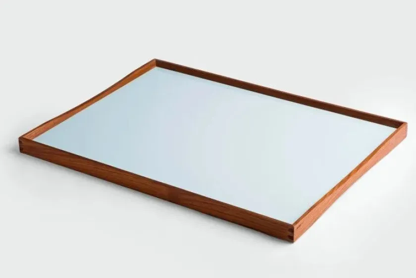 Turning Tray blev designet i 1956 af Finn Juhl og er fremstillet med den kurvede teaktræsramme og præcise hjørnesamlinger, der er blevet hans varemærke. Bakken er uden håndtag, men dens kurver gør, at der er plads til at alle størrelser hænder, fra børn til voksne, kan løfte den. Turning Tray er, som navnet antyder, tosidet med blanke laminatsider, der holdes sammen af den smukke teaktræsramme.