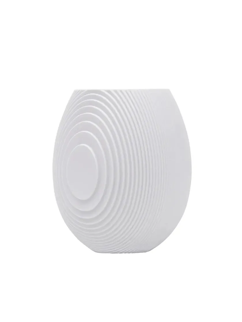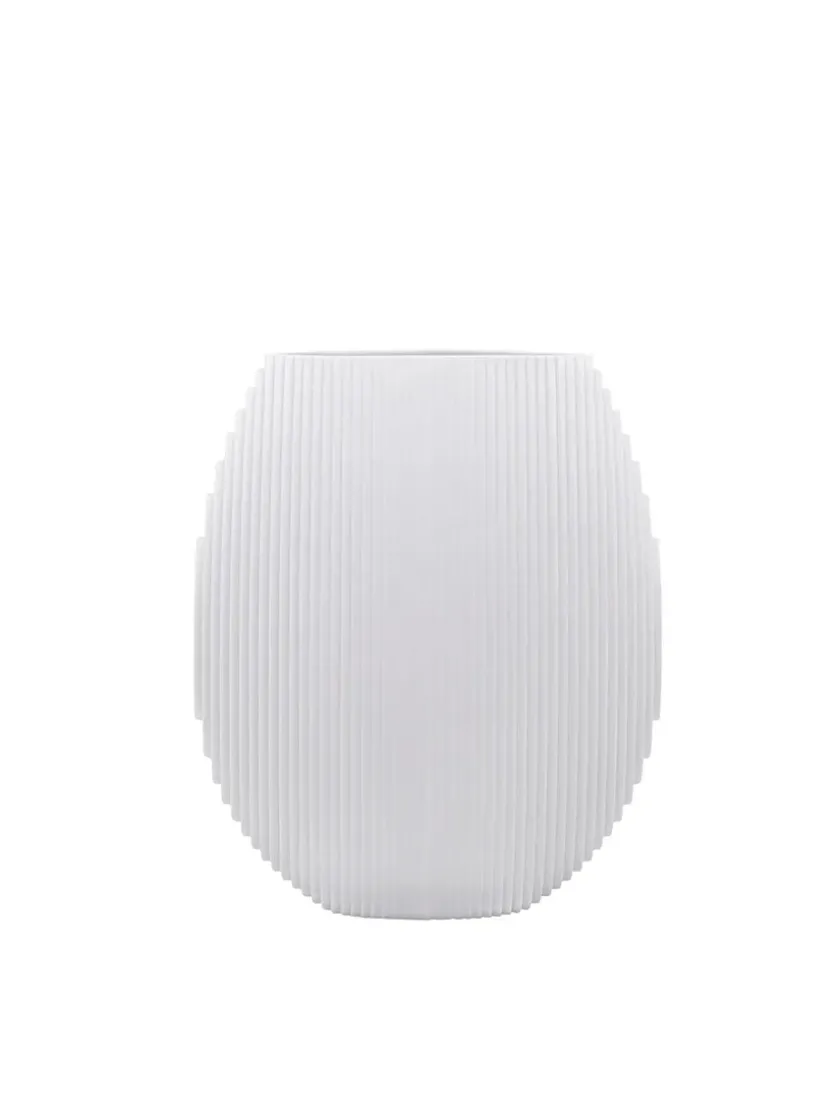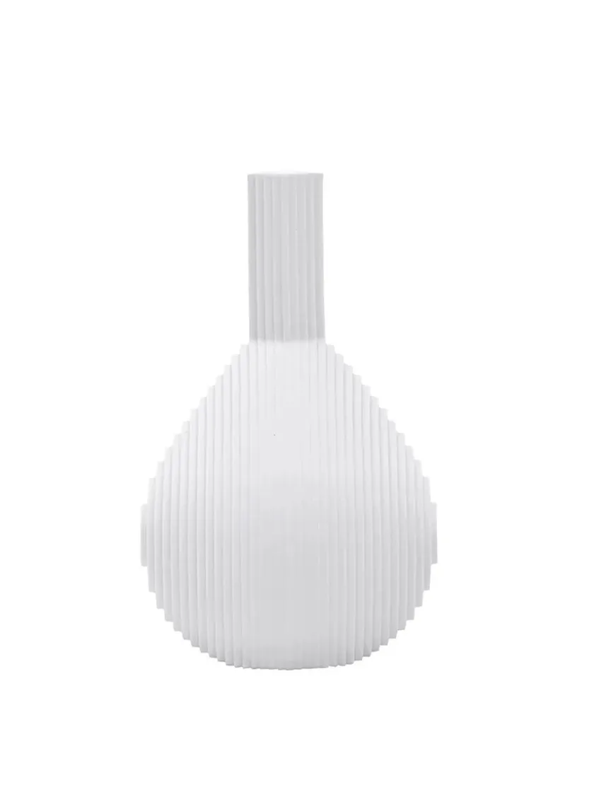 Inspireret af murstensstrukturen i Grundtvigs Kirke i København, skabte Vibeke Rytter Flow. Med distinkte linjer inviterer Flow til et spil af lys og skygger, der skaber illusioner af vandbølger. Placer Flow fredeligt alene eller sammen for at tilføje bevægelse i indretningen. De fine vaser er smukke på hylden, reolen, vindueskarmen og på bordet. Stil en lille blomst i vasen, eller lad den stå alene som et skulpturelt element.