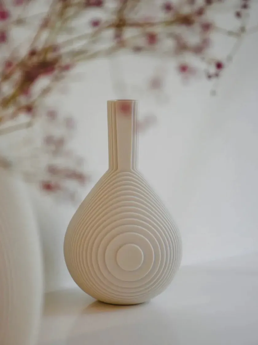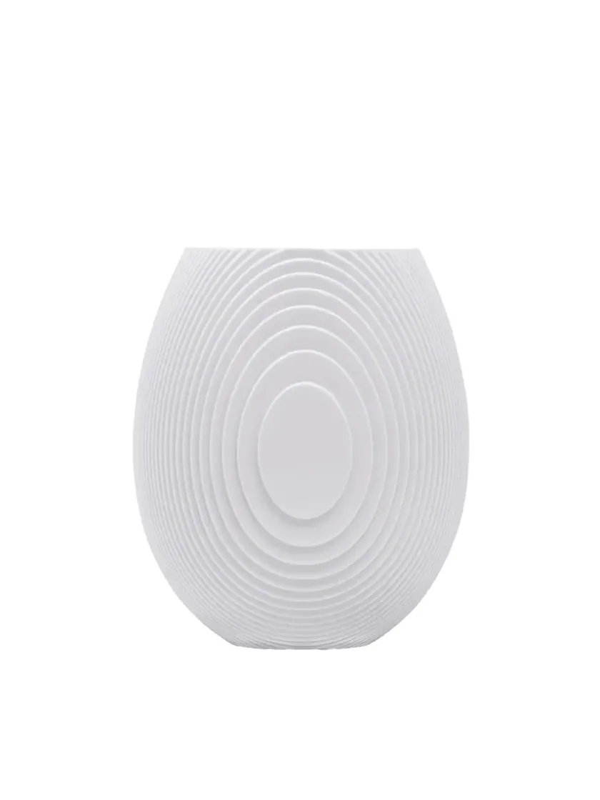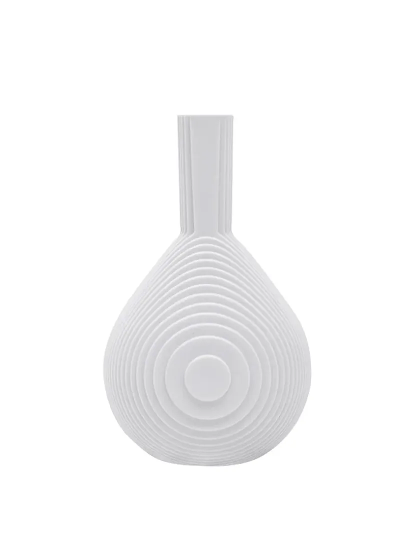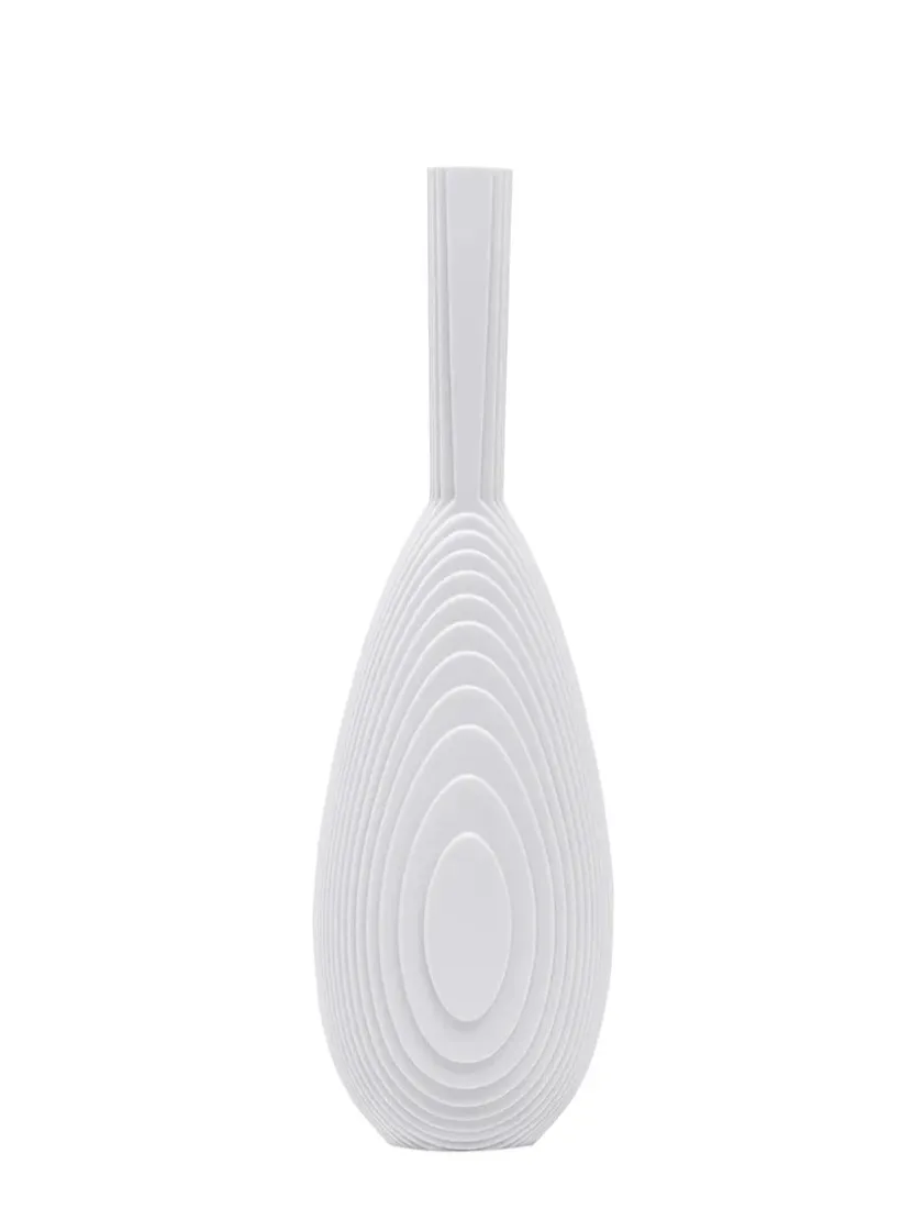 Inspireret af murstensstrukturen i Grundtvigs Kirke i København, skabte Vibeke Rytter Flow. Med distinkte linjer inviterer Flow til et spil af lys og skygger, der skaber illusioner af vandbølger. Placer Flow fredeligt alene eller sammen for at tilføje bevægelse i indretningen. De fine vaser er smukke på hylden, reolen, vindueskarmen og på bordet. Stil en lille blomst i vasen, eller lad den stå alene som et skulpturelt element.