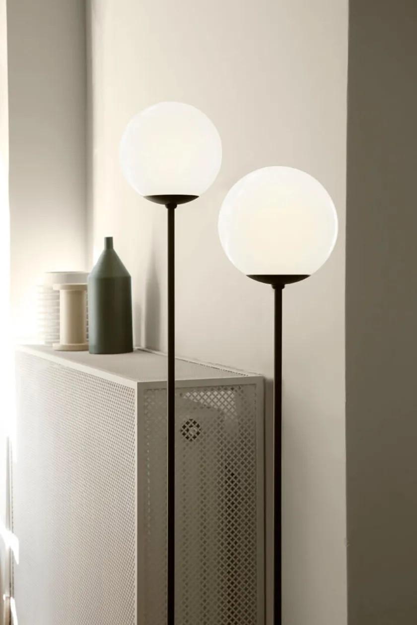 Model 1081 fra Astep tilfører Le Sfere-kollektionen en ny dimension af elegance og balance. Lampen har en markant visuel tilstedeværelse, hvor den opalhvide glasskærm hviler let på et sort stålstel og base.