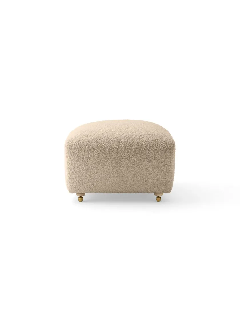 Fuldend komforten med Den Trætte Mand fodskammel i Baena 95 fra Audo Copenhagen. Den varme brunlige bouclé fremhæver de bløde, afrundede linjer og matcher lænestolen perfekt. Vælg ben i eg for et naturligt look – eller mørkbejdset eg for markant kontrast. De forreste messinghjul gør skamlen let at flytte mellem læsehjørnet, sofaen og pejsen.