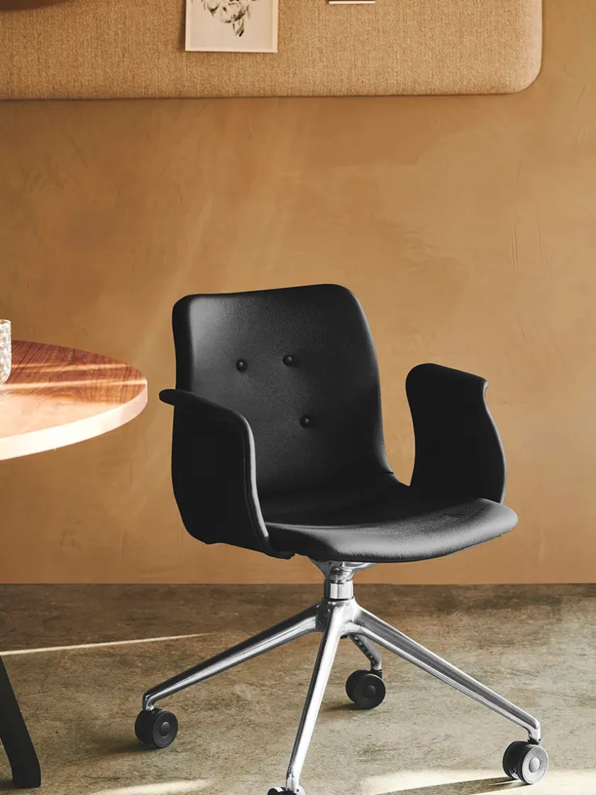 Den karakteristiske ryg bøjer sig let og tilpasser sig brugerens rygsøjle, hvilket giver optimal støtte gennem hele arbejdsdagen. Sæde og ryg er polstret med formstøbt koldskum og betrukket med eksklusive tekstiler eller læder. Det firestjernede stel i poleret eller sortlakeret aluminium sikrer stabilitet og er ikke drejeligt.
