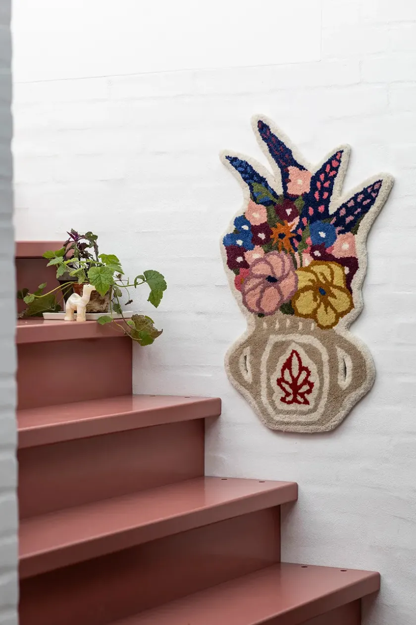 Flower Bouquet Rug er et håndlavet vægtæppe i 100% uld. Brug det dekorative tæppe som et blødt supplement til din billedvæg, for at skabe et sjovt og anderledes udtryk.
