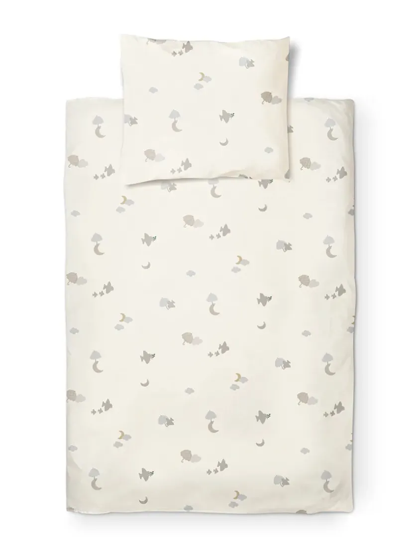 Det bløde babysengetøj fra Moonboon er fremstillet af økologisk GOTS-certificeret bomuld, hvilket gør det både skånsomt og holdbart. Sengetøjet fås i tre søde og eventyrlige mønstre, som er inspireret af H.C. Andersens eventyr “Ole Lukøje”.