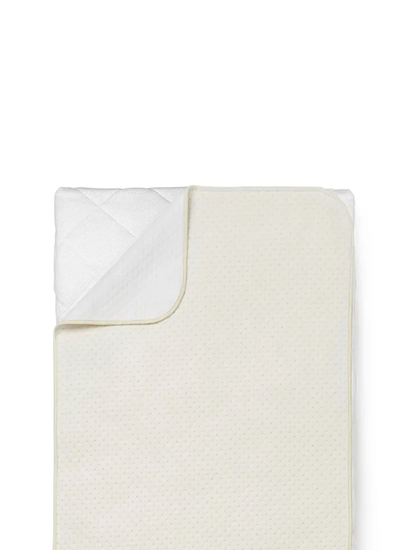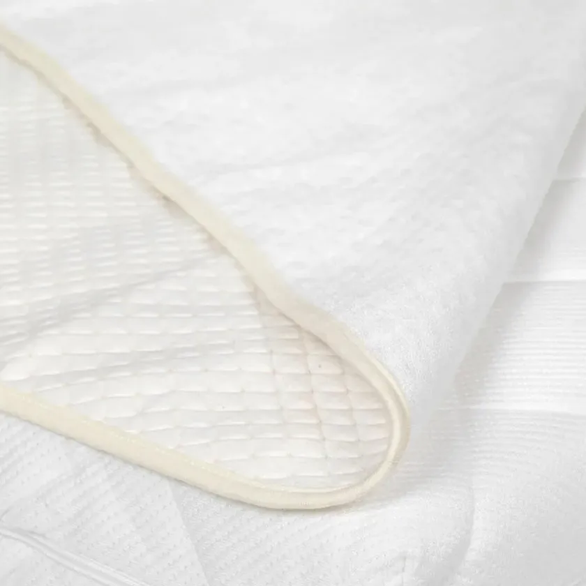 Overfladen er i blødt quiltet bomuld, der giver maksimal komfort. Frottébagsiden sikrer, at madrassen bliver på plads.