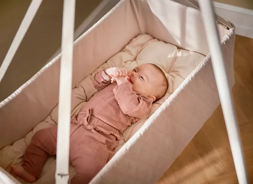 Vuggen er GOTS-certificeret og kommer med en blød skummadras og et quiltet betræk i 100% økologisk bomuld med harlekinmønster.