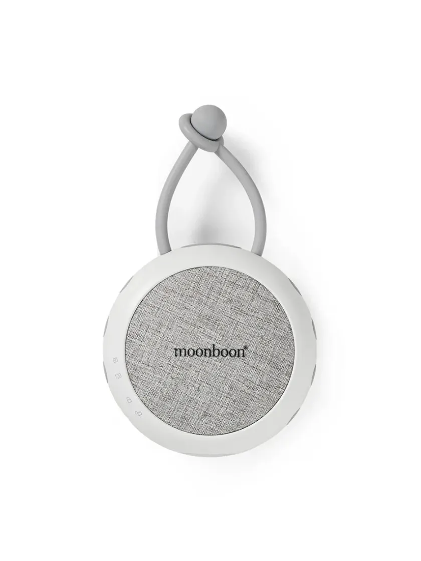 Højtaler fra Moonboon, som hjælper dit barn med at falde i søvn og sove bedre. Højtaleren indeholder 10 afslappende lyde. Der kan vælges mellem white, pink og brown noises, som beroliger og mindsker uro og gråd. Du kan også vælge womb sounds, som minder om lydende fra tiden i maven. Det skaber en tryg stemning, der hjælper barnet med at falde i søvn.
