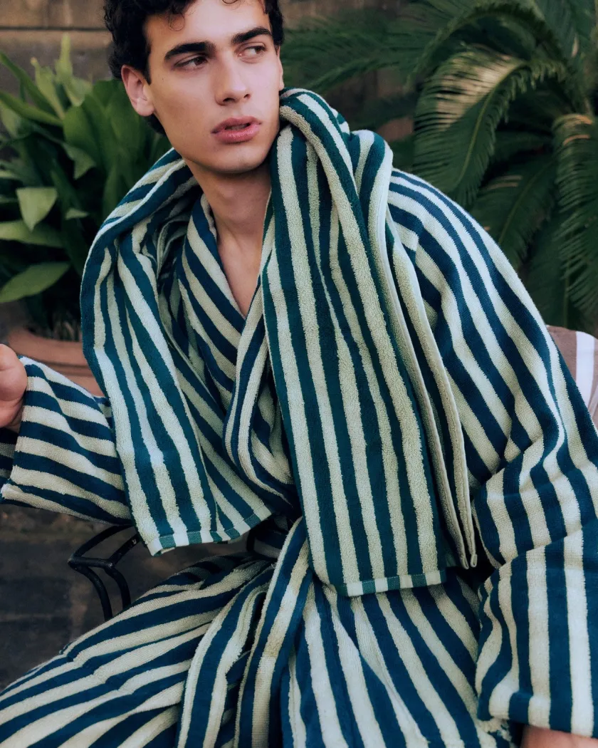 Svøb dig i Naram badekåben fra Bongusta i farven creme & ink – en blød, absorberende frotté i 100% kæmmet OEKO-TEX® bomuld, vævet i 385 g/m² for høj komfort og holdbarhed. Den lange, unisex pasform er skabt til rolige morgener og stunder efter badet: sjalkrave, åben front, to rummelige lommer og et kraftigt bindebælte giver både funktion og luksus i hverdagen. Længden er tænkt til fuld dækning; er du over 176 cm eller ønsker et løsere udtryk, anbefales L/XL. Naram fås i to størrelser, og længden måles fra nakke til bundsøm: S/M 122 cm og L/XL 138 cm. Den kæmmede kvalitet polerer fibrene for glans og en silkeblød fornemmelse, og kåben kan vaskes ved 60°; ophængsløkke i kraven gør hverdagen nem. Kort sagt: tidløs, farverig velvære fra Bongusta.