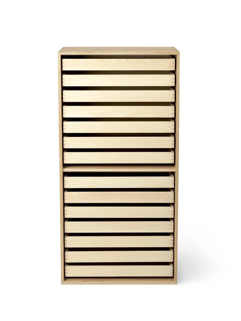 FK63 Bookcase System Bogreolsystemet fra Carl Hansen & Søn er tegnet af Preben Fabricius og Jørgen Kastholm i 1963 og er et særpræget møbel til ethvert rum. FK63 Reolsystemet tilbydes i en vægmonteret udgave såvel som i et fritstående design, der hviler på et slankt stel i pulverlakeret stål. Dette modul har ét åbent rum og syv bakker.