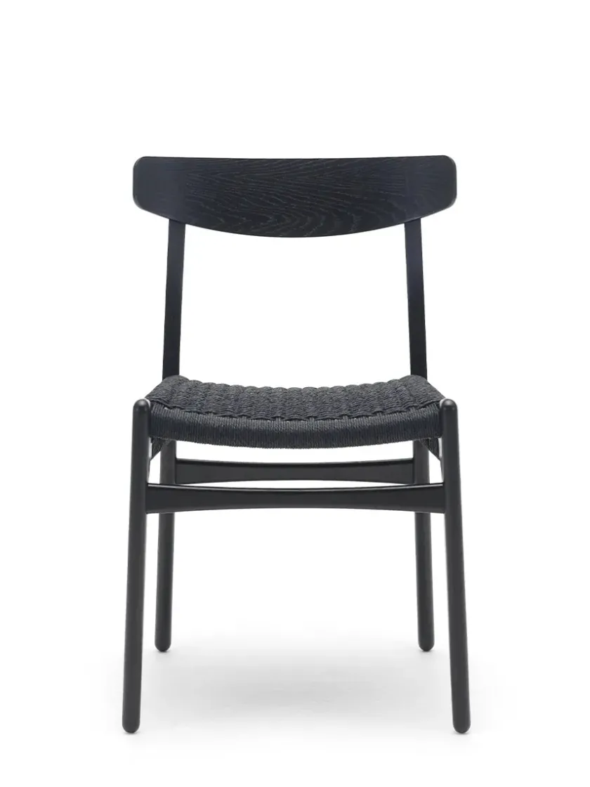 CH23 spisebordsstolen er en tidløs klassiker, designet af Hans J. Wegner i 1950. Stolen er et af de fem første møbler, han tegnede eksklusivt for Carl Hansen & Søn. CH23 er her fremstillet i massivt olieret valnød med et fineret ryglæn. CH23 udmærker sig ved sine mange fine detaljer, herunder de karakteristiske korsformede dækpropper i ryggen, samt det dobbeltflettede papirgarnssæde, som her er i sort.