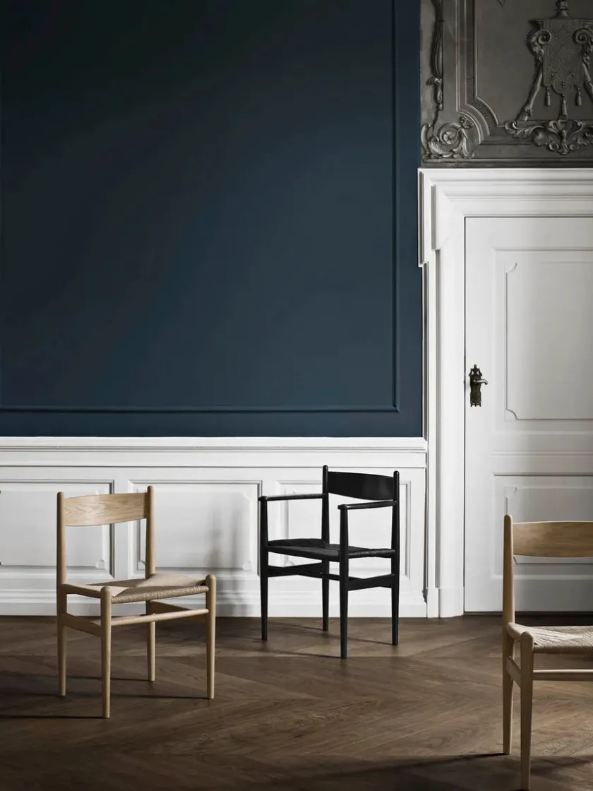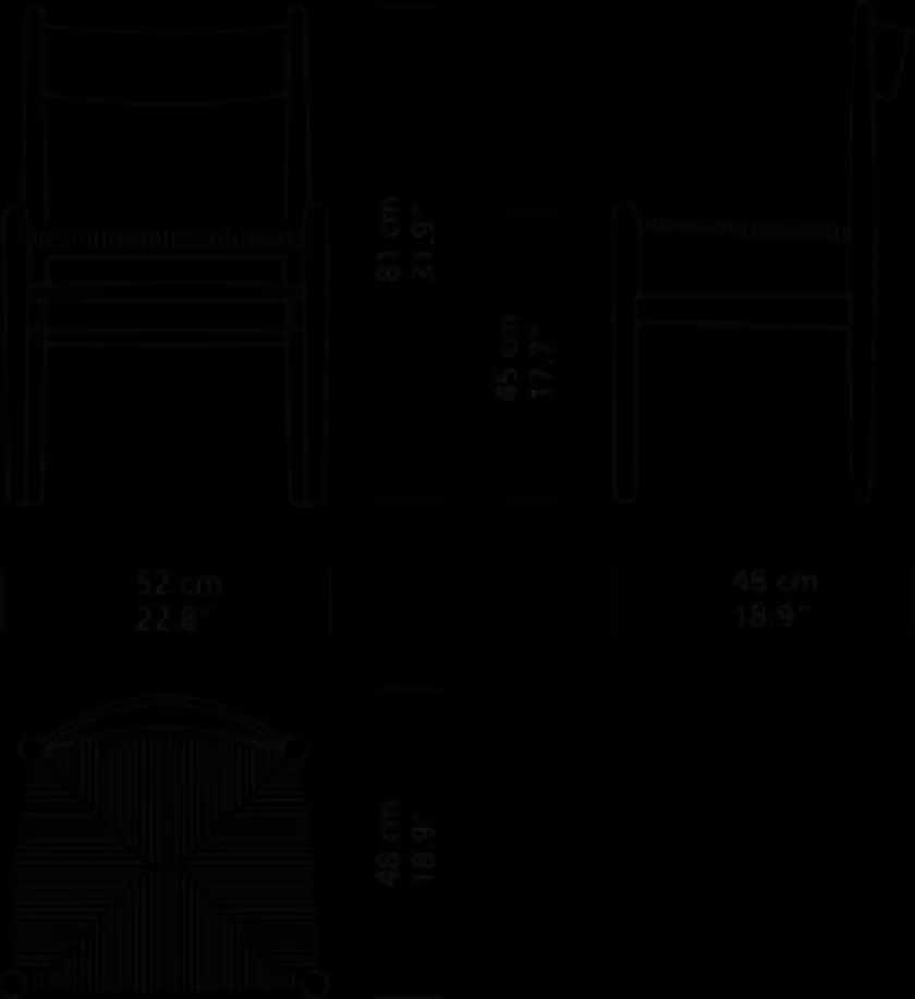 En veludført, klassisk spisestol med fortrinlig komfort. Stolen er meget brugt i konferencerum, kirker osv. De rene og stringente linjer viser tydeligt Wegners Shaker inspiration. Sædet er smukt håndvævet af gedigent papirgarn, enten i ubleget/natur eller sort.