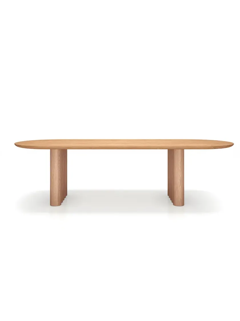 DK3s Plush Table oser af eksklusivitet og finesse. Bordet er et vaskeægte DK3 mesterværk, hvor man virkelig ser, hvor meget der bliver nørdet med detaljerne. Plush Table Oval har to store ben i massivtræ, der giver bordet masser af karakter og varme med de runde former og silhuetter. Bordet lever til fulde op til sit navn med sine bløde former, der i samspil med træets robusthed og bordpladens enkle elegance udgør en imponerende helhed.