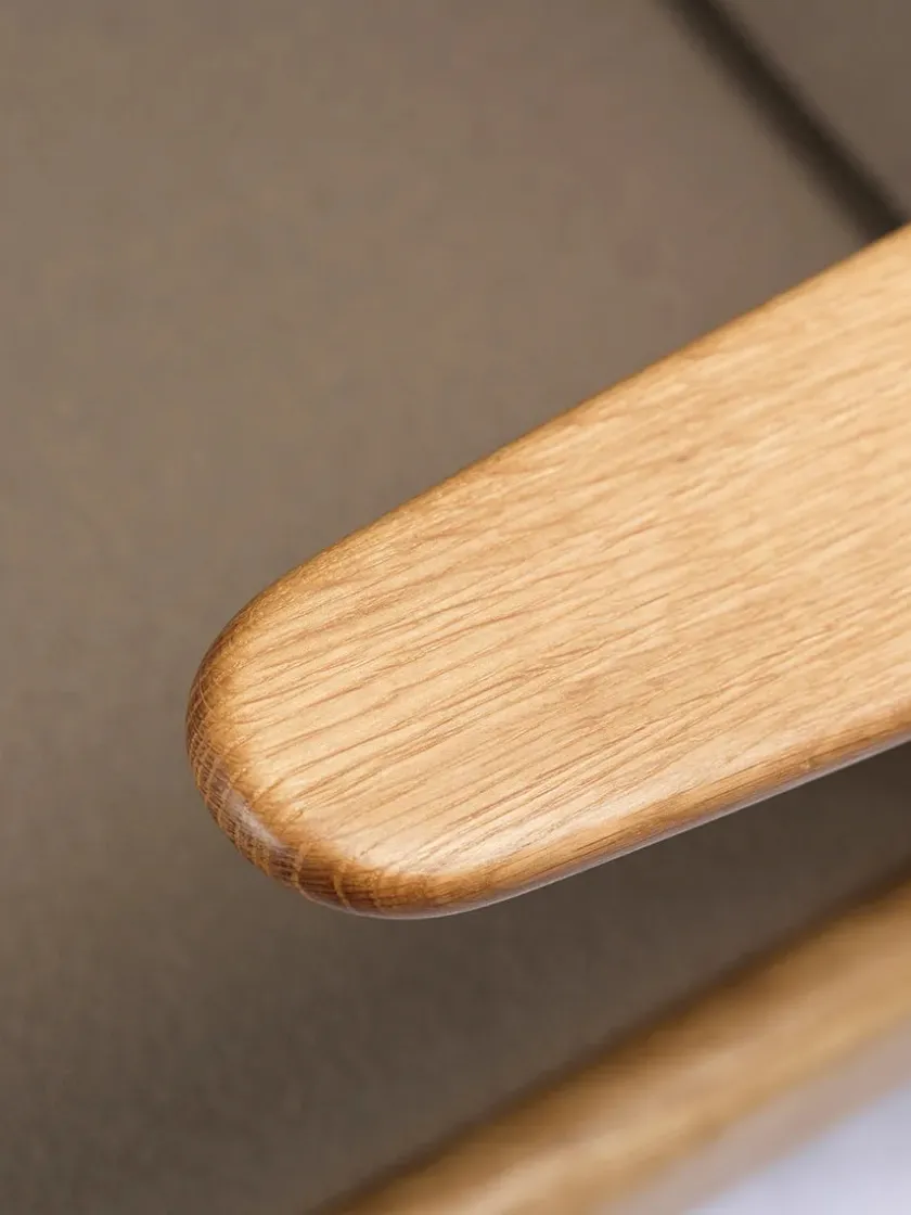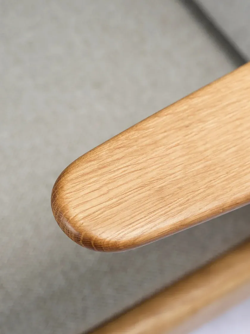 Lænestolen har hynder i fire forskellige farver, og stel i olieret egetræ.