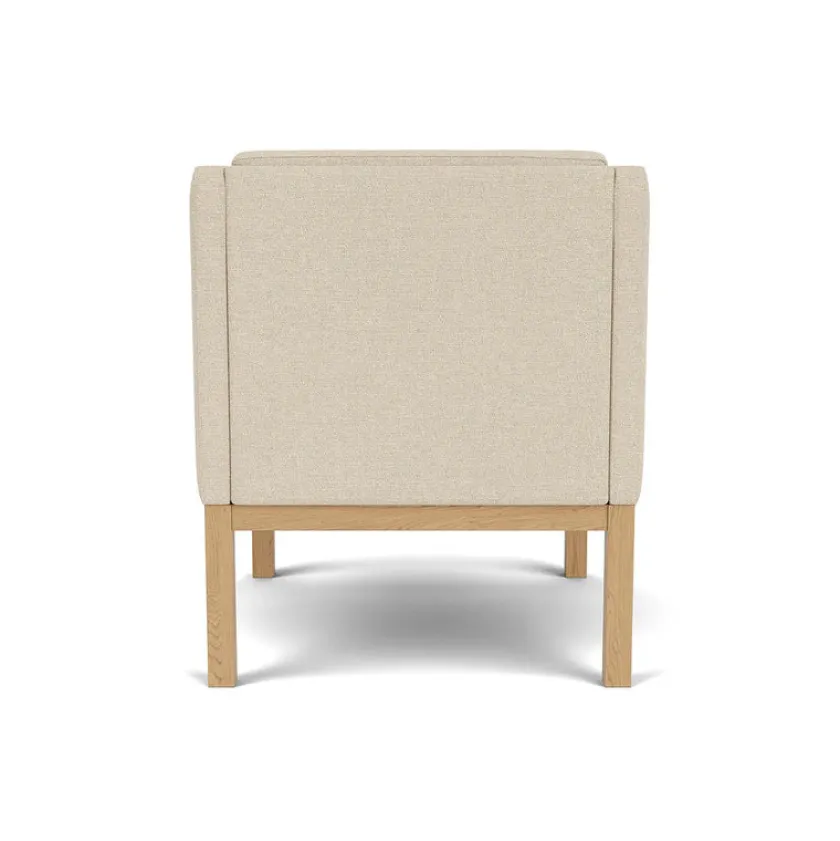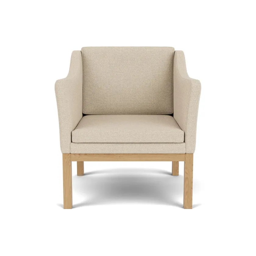 Mogens Kochs L46 MK155 lænestol kombinerer tidløs funktionalisme med moderne elegance. Med sit karakteristiske synlige træstel og bløde polstring i beige tekstil fremstår stolen både enkel og indbydende. Designet i 1947 til Gammel Køgegaard er L46 MK155 et udtryk for Kochs kompromisløse tilgang til ærligt håndværk og lette, klare linjer – et møbel der med sin varme nuance og arkitektoniske tydelighed harmonerer med moderne hjem.