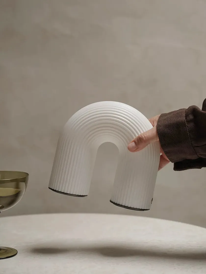 Den skønne Vuelta bordlampe fra Ferm Living kommer nu i en portable udgave, således den kan tages med på farten. Lampen er en skulpturel bue, som minder om gamle søjler. Vuelta er lavet af HDPE plast, og giver et dejligt blødt og diffust lys. Lampen kan dæmpes, så den kan give forskellige stemninger.