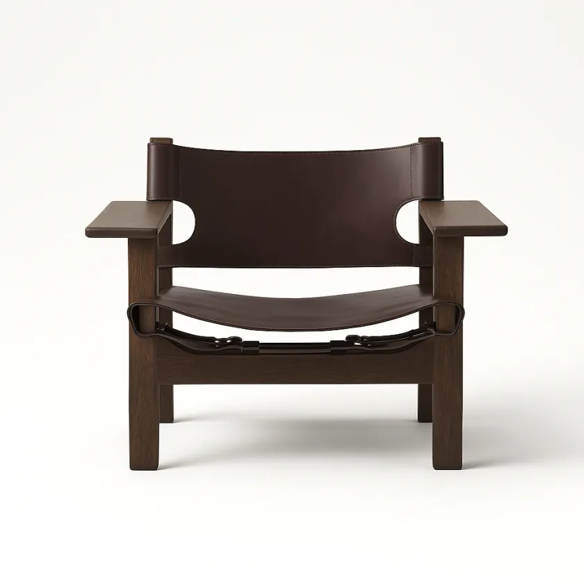 Den Spanske Stol af Børge Mogensen er et ikon inden for dansk møbeldesign – et mesterværk i håndværk, ærlighed og materiale forståelse. Inspireret af spanske ridderstole og Mogensens fascination af funktionel skønhed, udstråler stolen både styrke og ro. Den brede form og de justerbare læderremme skaber en afslappet siddeoplevelse, hvor hvert materiale får lov til at tale sit eget sprog. Kombinationen af olieret røget eg og mørkebrunt kernelæder giver stolen et varmt, eksklusivt udtryk, der kun bliver smukkere med tiden, efterhånden som læderet patinerer og træet får dybere glød. Den Spanske Stol er et samlerobjekt og et tidløst møbel, der tilfører karakter og ro til både moderne og klassiske rum.