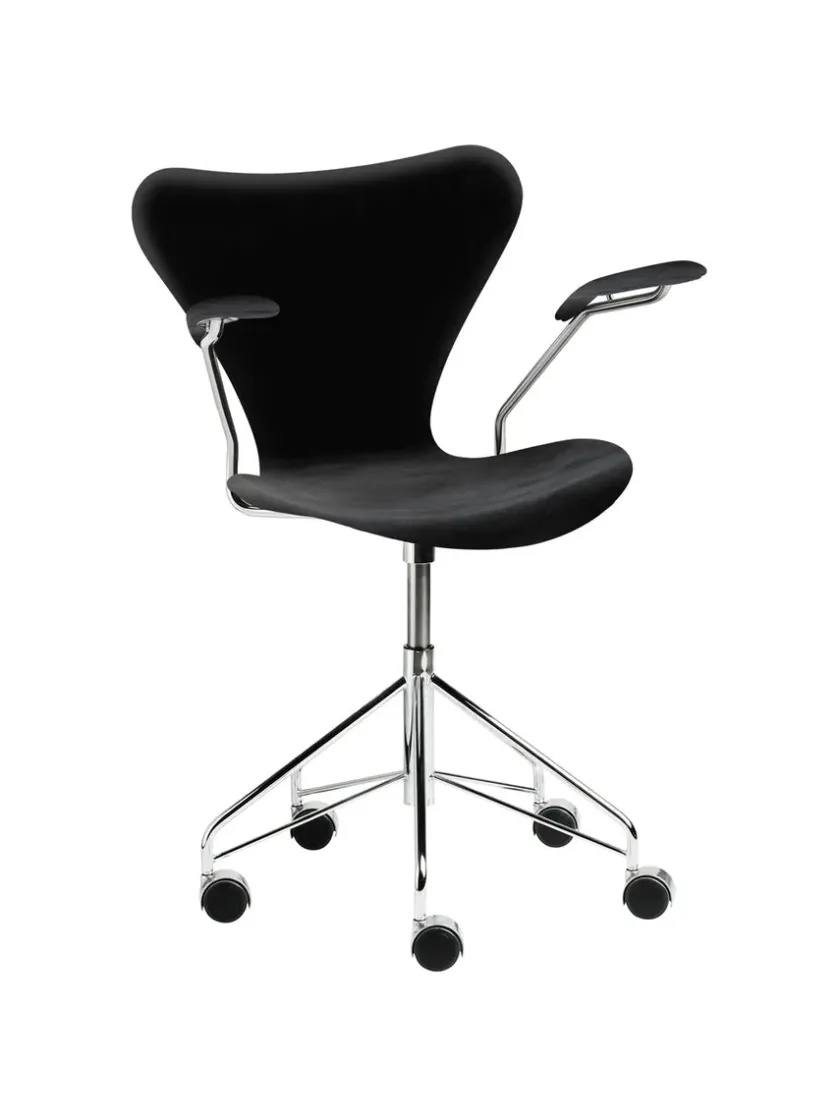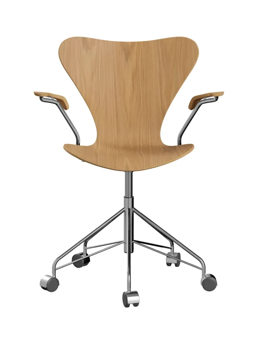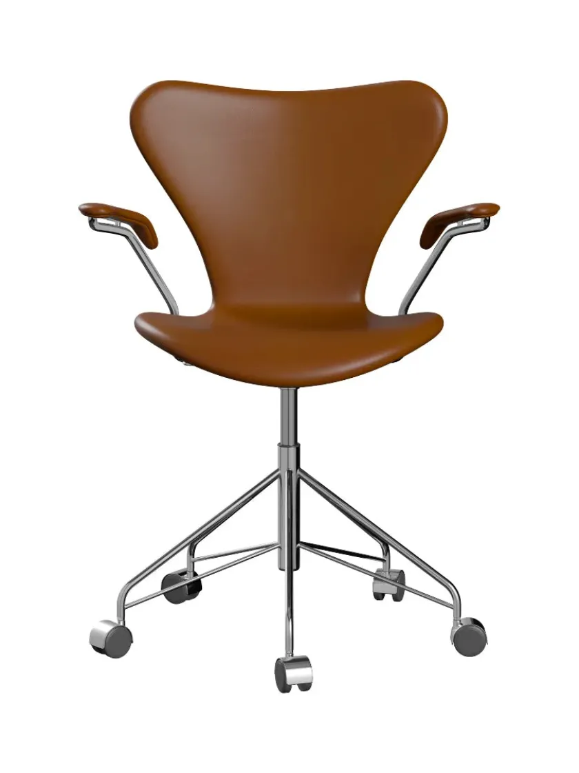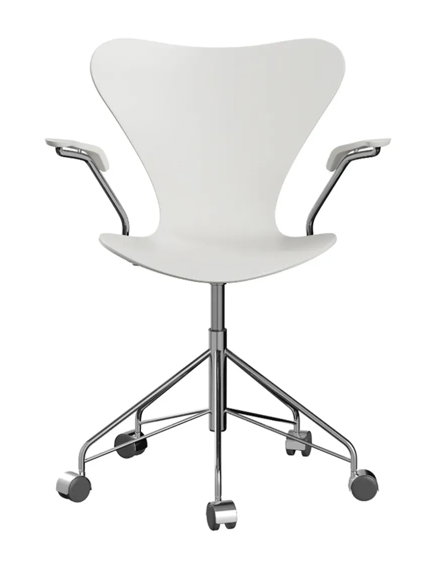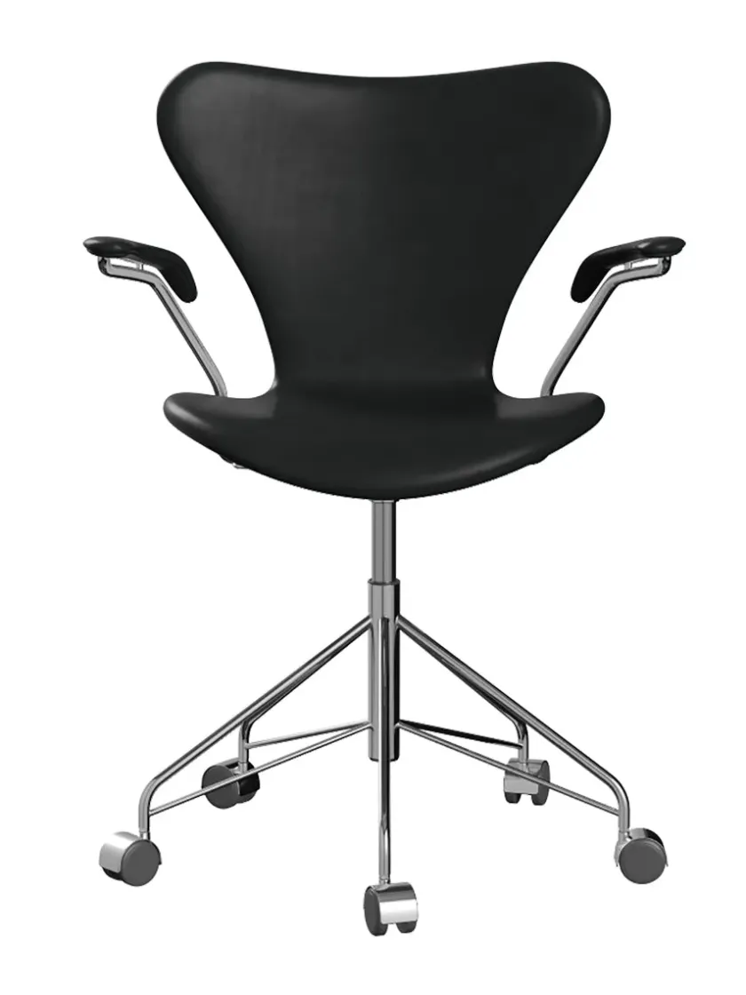 En vaskeægte klassiker. 3217 drejearmstolen af Arne Jacobsen er designet tilbage i 1950’erne. Designet er i dag lige så aktuelt, som det var dengang. 7’er kontorstolen er et klassisk stykke design, der både er funktionelt og smukt at se på. Oplev komforten ved Arne Jacobsens verdensberømte syver-stol ved skrivebordet. Kontorstolen er med armlæn fra Fritz Hansen og med forkromet stel. Vælg stolen i følgende udgaver: – Farvet ask – Natur finer – Lakeret – Fuldpolstret læder Hjul/bremser: Hårde baner til bløde gulve, u/brems Hårde baner til bløde gulve, m/brems Bløde baner til hårde gulve, u/brems Bløde baner til hårde gulve, m/brems.