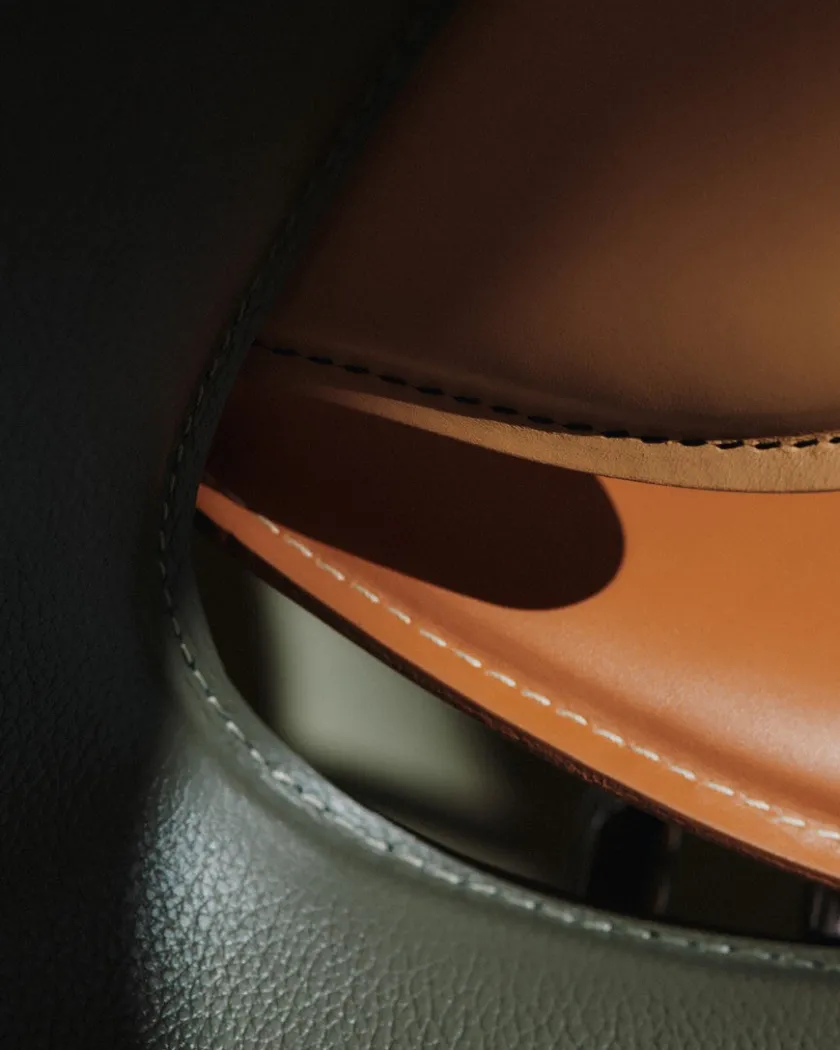 Sædet er beklædt med kraftigt sadellæder, der smyger sig om stolens organiske kurver. Syningerne og den markerede kant fremhæver silhuetten og tilfører associationer til fin lædervarekunst – raffineret som en håndtaske eller en sadel, skabt med kompromisløs sans for detaljen.