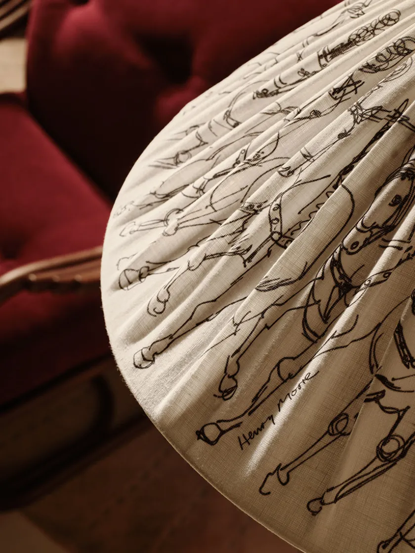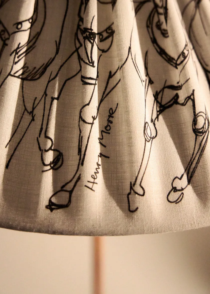 GUBI’s ikoniske 9602 gulvlampe er designet af Paavo Tynell. Lampen er kendetegnet ved sin brede, koniske skærm og den elegante rattanomviklede stang, her smukt afbalanceret af en poleret messingbase for et tidløst udtryk. I denne Garro Éditions specialudgave er skærmen med Henry Moores ‘Haringey Circus Horses’, som tilfører skulpturel dybde og et levende spil i foldene. Gulvlampen skaber et blidt og varmt lys. Perfekt som læselampe ved sofaen eller som skulpturel belysning i stuen, soveværelset eller entréen.