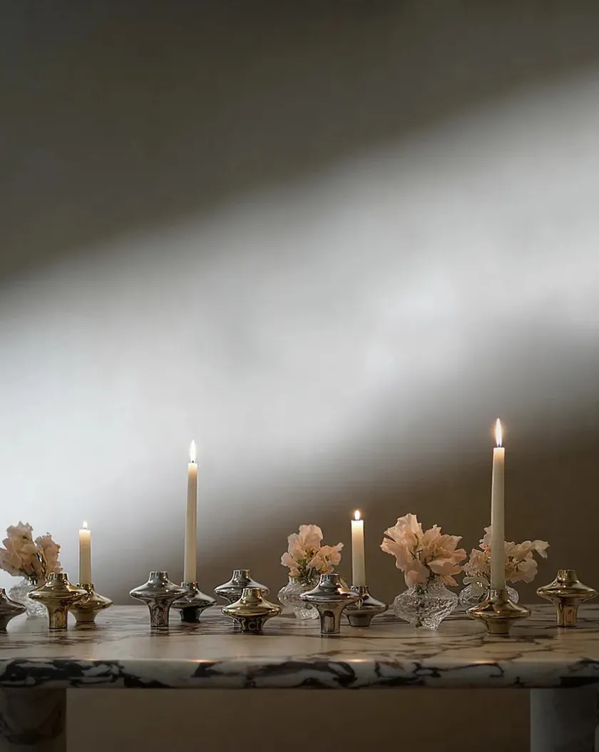Smuk lysestage fra Hein Studio i messing med sølvfinish. Doublet lysestagerne er håndlavede i massivt messing med en nickel-belægning, og der kan derfor forekomme små ujævnheder i stagerne. Dette er en del af udtrykket og giver hver enkelte stage liv og karakter. Messing er et naturmateriale, der med tiden vil patinere og bliver mørkere.