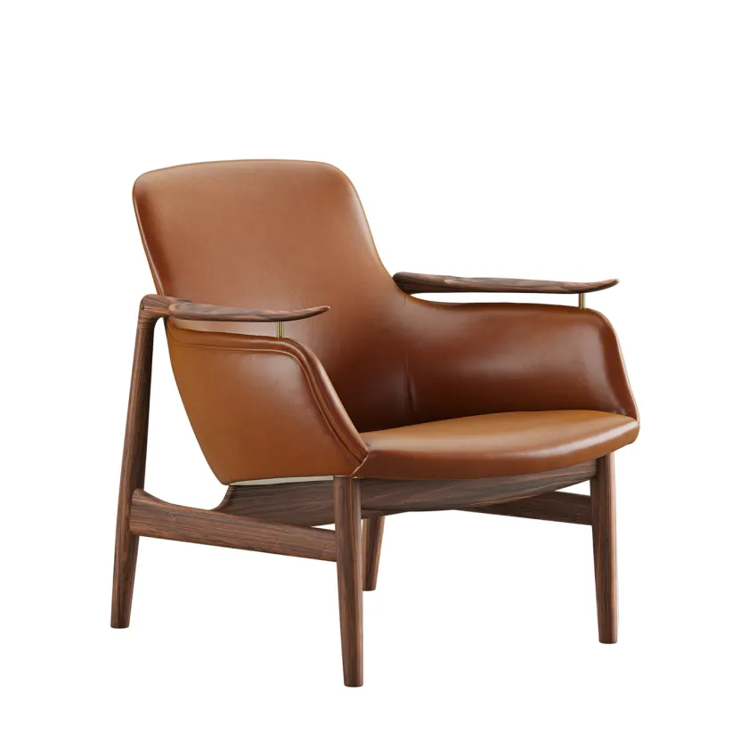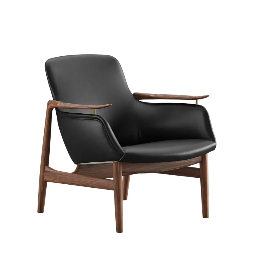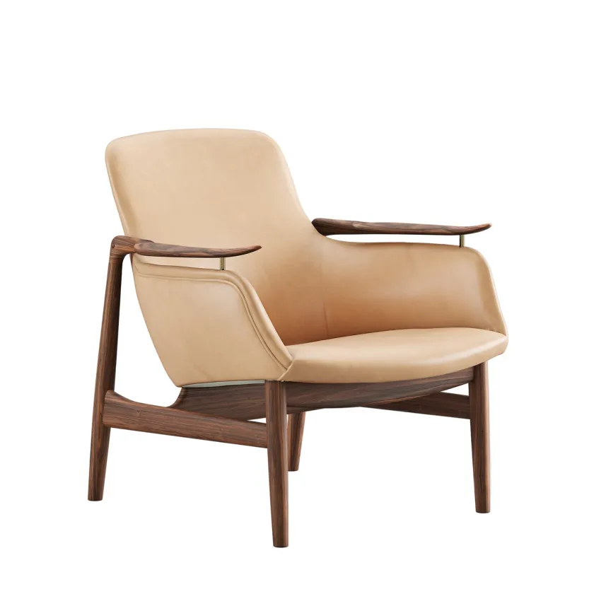 FJ 53 fremstår som et ekstravagant møbel, hvor træstolens lethed og æstetik forenes med et polstret korpus, der giver en indbydende og omsluttende komfort. Finn Juhls ikoniske designprincip – den tydelige adskillelse mellem det bærende og det bårne – er videreført i FJ 53 og udført med en særlig raffinement, der tilfører møblet en elegant og skulpturel karakter.