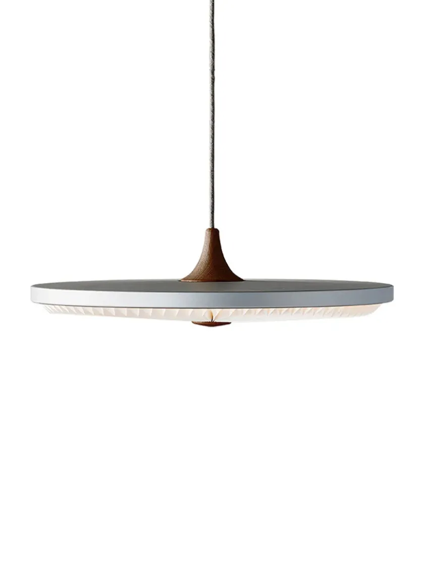 Soleil betyder sol på fransk, og lampen har samme fine egenskaber med en lysspredning som en strålende sol – der spreder lyset fra sit centrum. Le Klint Soleil pendlens slanke design gør den meget anvendelig til at hænge over spisebordet, i restauranten eller mødelokalet. Lampen er uden lysdæmper, men kan benyttes med Casambi lysdæmper, hvor man kan styre lysstyrken via en gratis app/bluetooth på sin mobiltelefon. Soleil kan ikke benyttes sammen med andre allerede installerede lysdæmper-funktioner i boligen. Mål: Diameter: Ø 50 cm. Højde: 6 cm. Farve: Silver Cloud Træsort: Røget eg Skærm: Standard (plast) Model: 198 Designet af: Philip Bro Ludvigsen