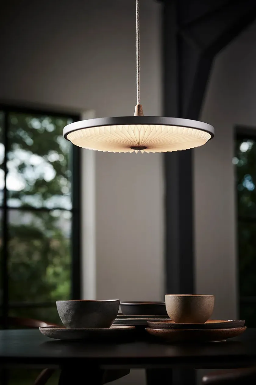 Soleil betyder sol på fransk, og lampen har samme fine egenskaber med en lysspredning som en strålende sol – der spreder lyset fra sit centrum. Le Klint Soleil pendlens slanke design gør den meget anvendelig til at hænge over spisebordet, i restauranten eller mødelokalet. Lampen er uden lysdæmper, men kan benyttes med Casambi lysdæmper, hvor man kan styre lysstyrken via en gratis app/bluetooth på sin mobiltelefon. Soleil kan ikke benyttes sammen med andre allerede installerede lysdæmper-funktioner i boligen. Mål: Diameter: Ø 35 cm. Højde: 5 cm. Farve: Silver Cloud Træsort: Røget eg Skærm: Standard (plast) Model: 198 Designet af: Philip Bro Ludvigsen