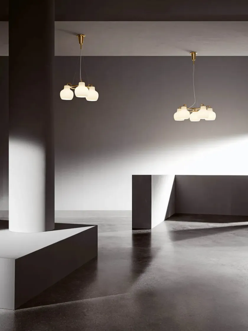 Lysekronen fra Louis Poulsen udsender primært et nedadrettet lys. Det opale glas giver en behagelig og ensartet belysning af området omkring armaturet.