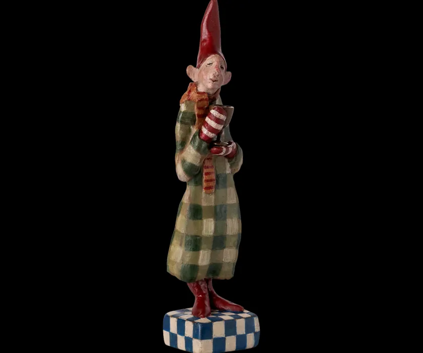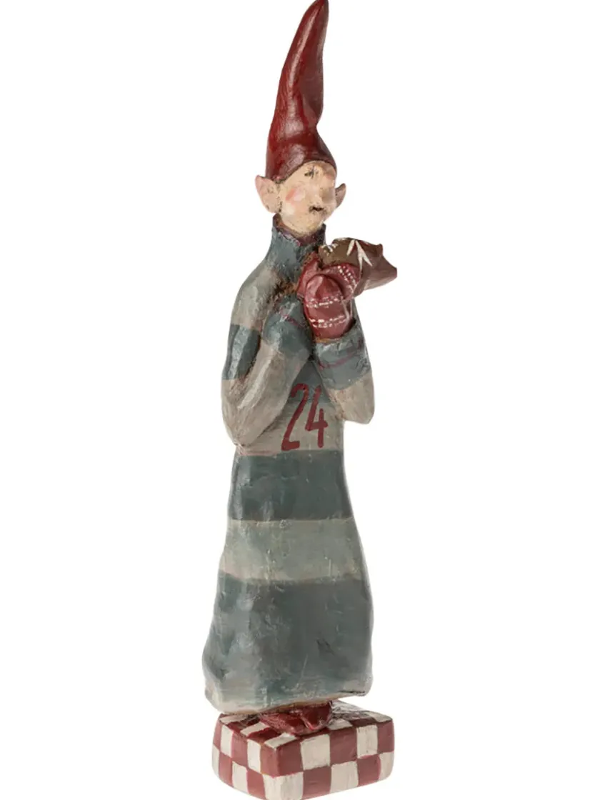 Et Maileg samleobjekt. Hvert år designer de en ny unik nisse. Denne smukke figur er formet i hånden og bagefter håndmalet. Hver figur har sit eget unikke udtryk og er pakket i en gaveæske. Nisse der står fornærmet med armene over kors.
