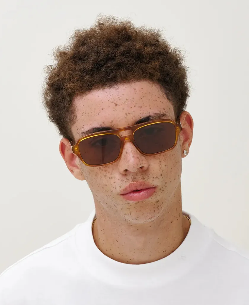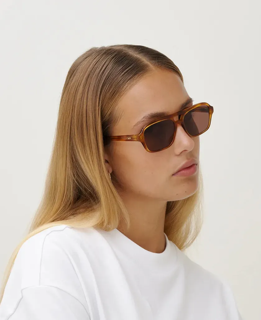 Seje solbriller fra MessyWeekend. BURT solbrillen er en aviator-brille. Her med stel i brown havana, der bløder solbrillen op.