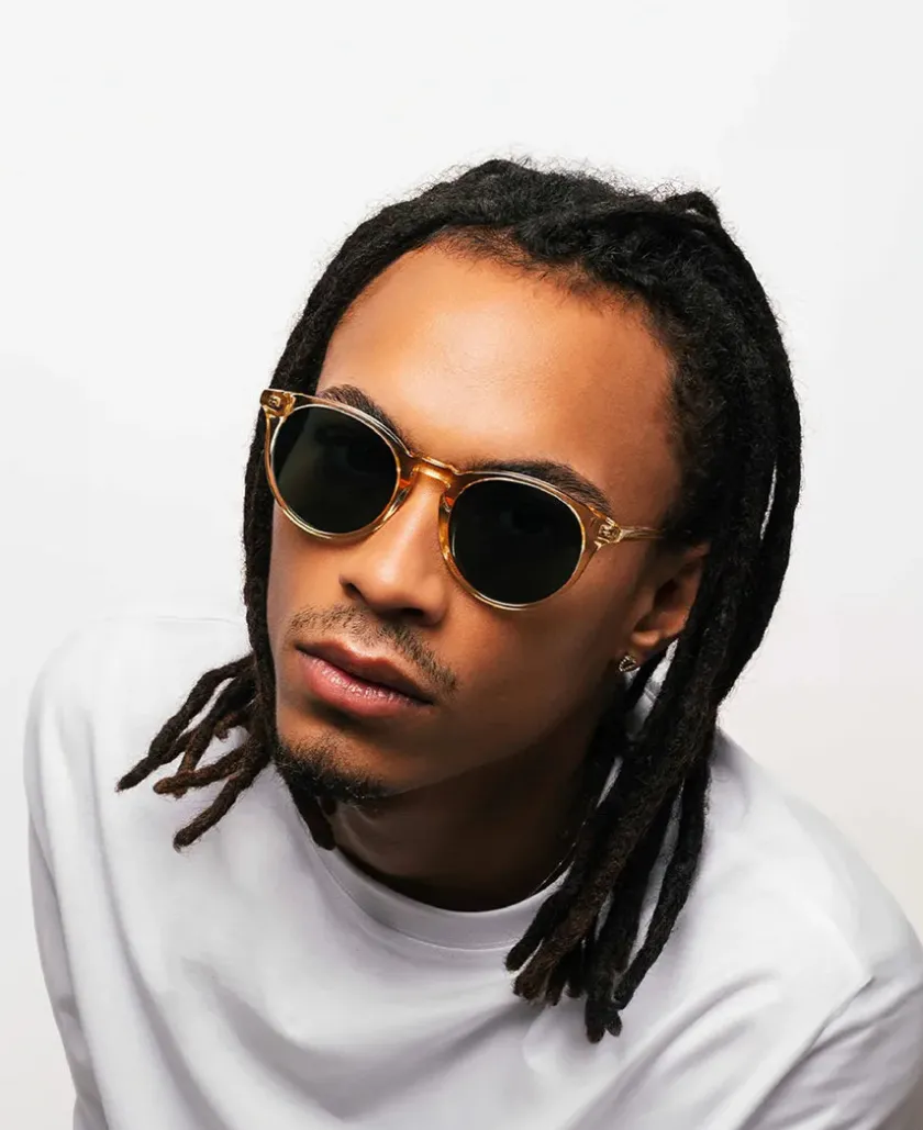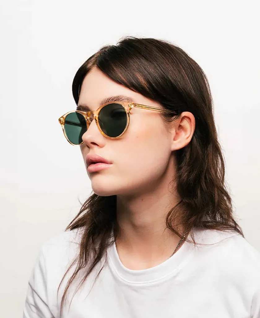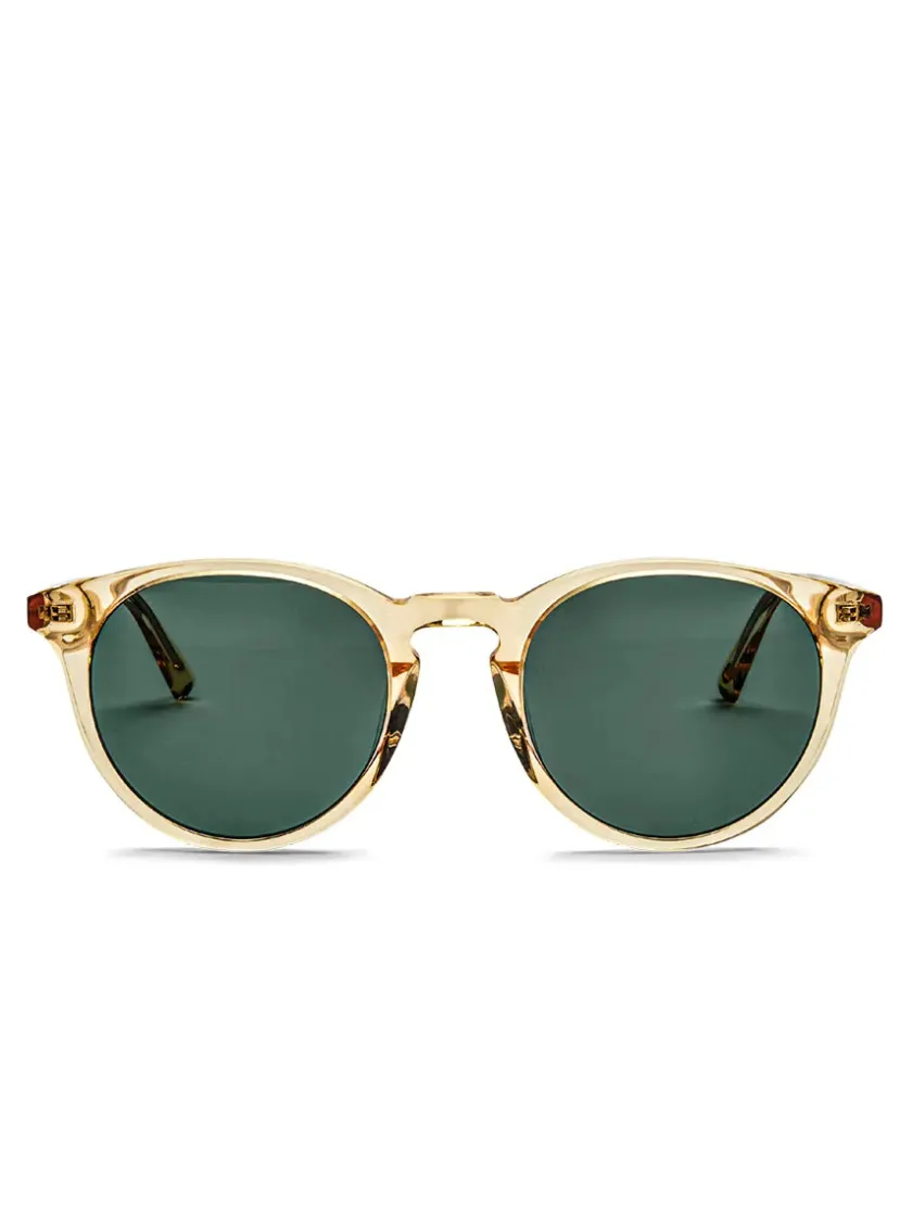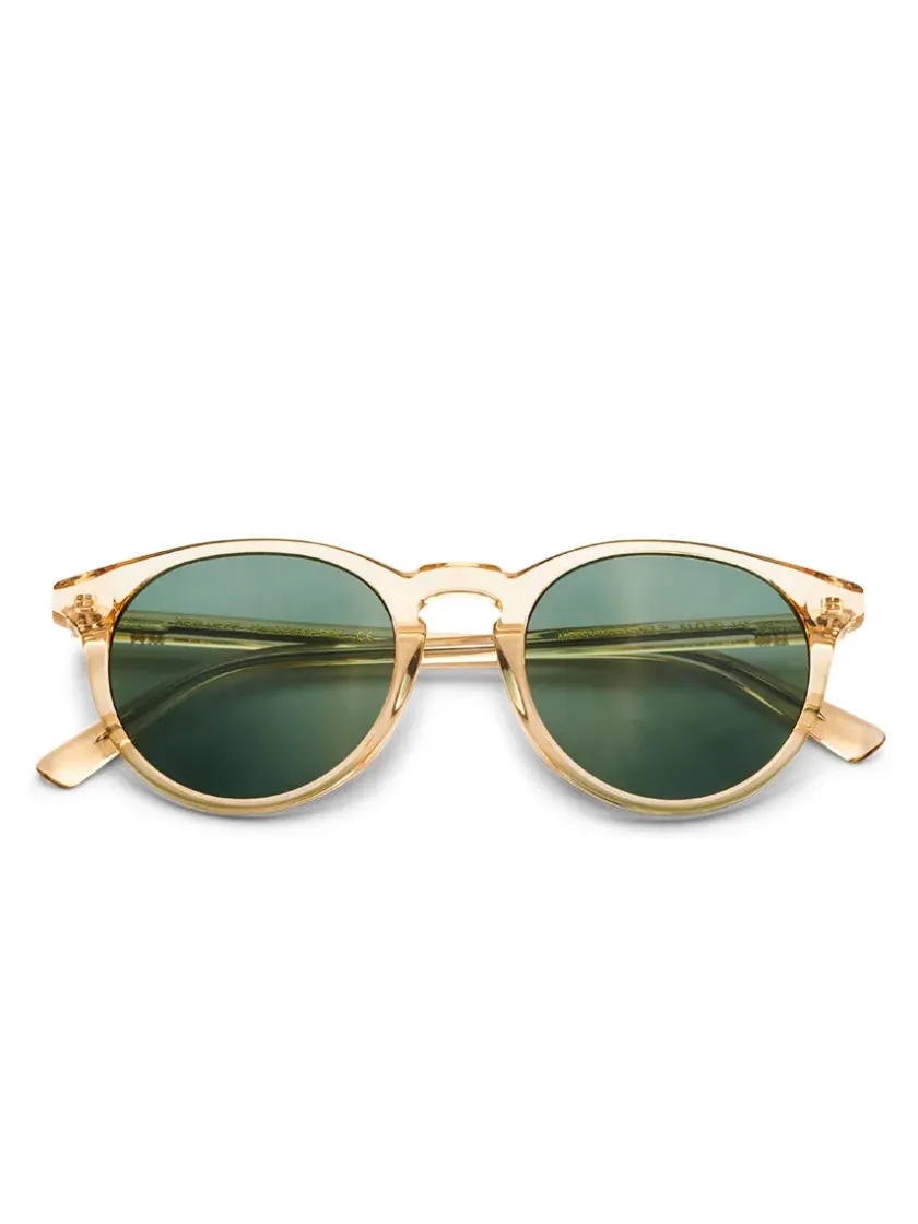 Seje solbriller fra MessyWeekend. NEW DEPP solbrillen er en klassisk solbrille. Her med stel i champagnefarve og med grønt glas, der giver kant og karakter til solbrillen.