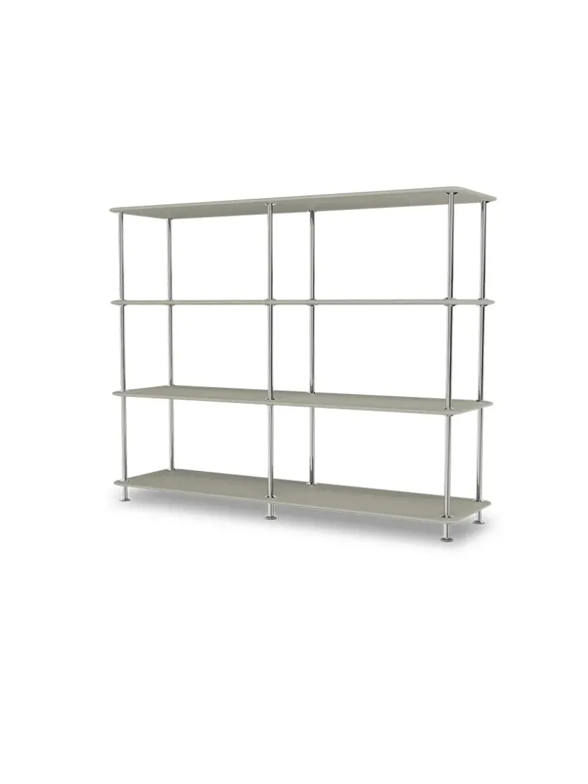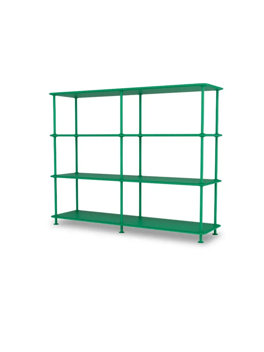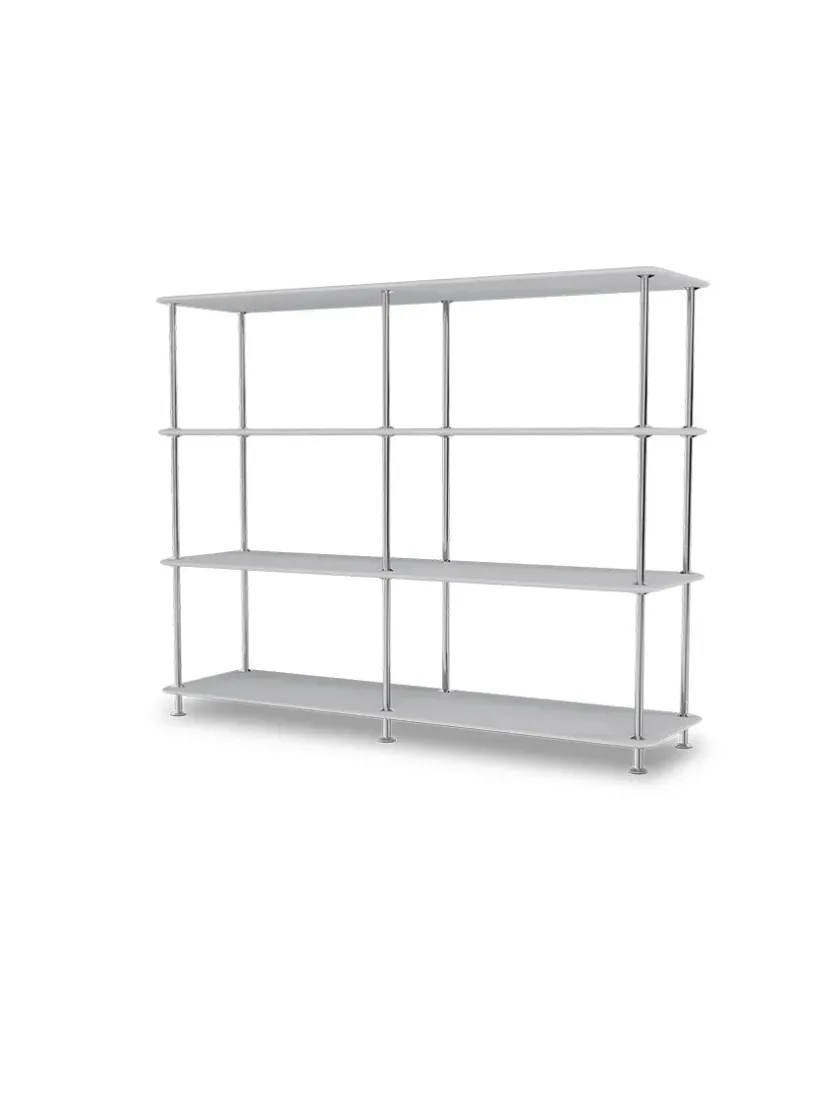 Montana Free reolsystemet er opbygget af lakerede MDF-hylder i dybde 38 adskilt af tynde stager i krom, der giver et let og svævende udtryk og understreger de horisontale hylder.