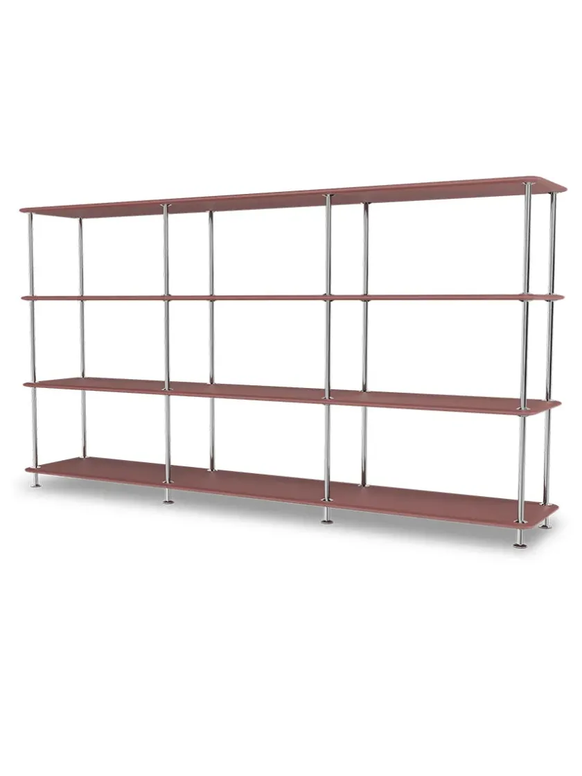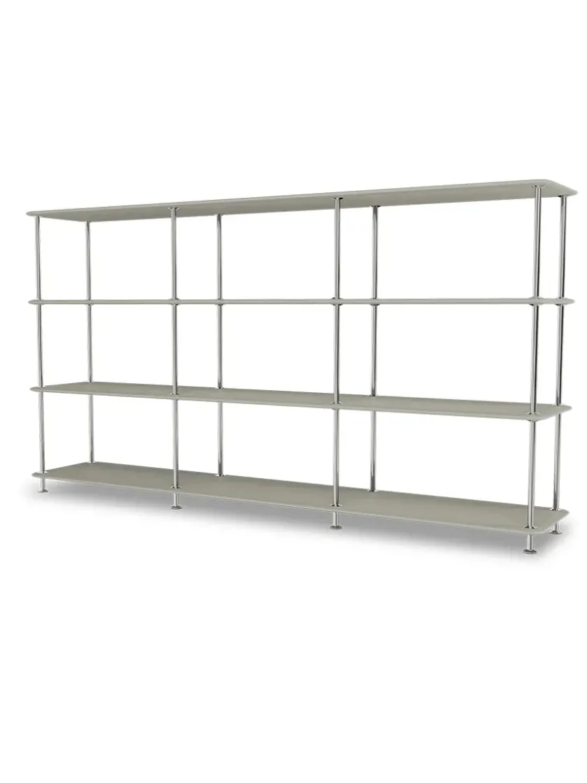 Montana Free reolsystemet er opbygget af lakerede MDF-hylder i dybde 38 adskilt af tynde stager i krom, der giver et let og svævende udtryk og understreger de horisontale hylder.