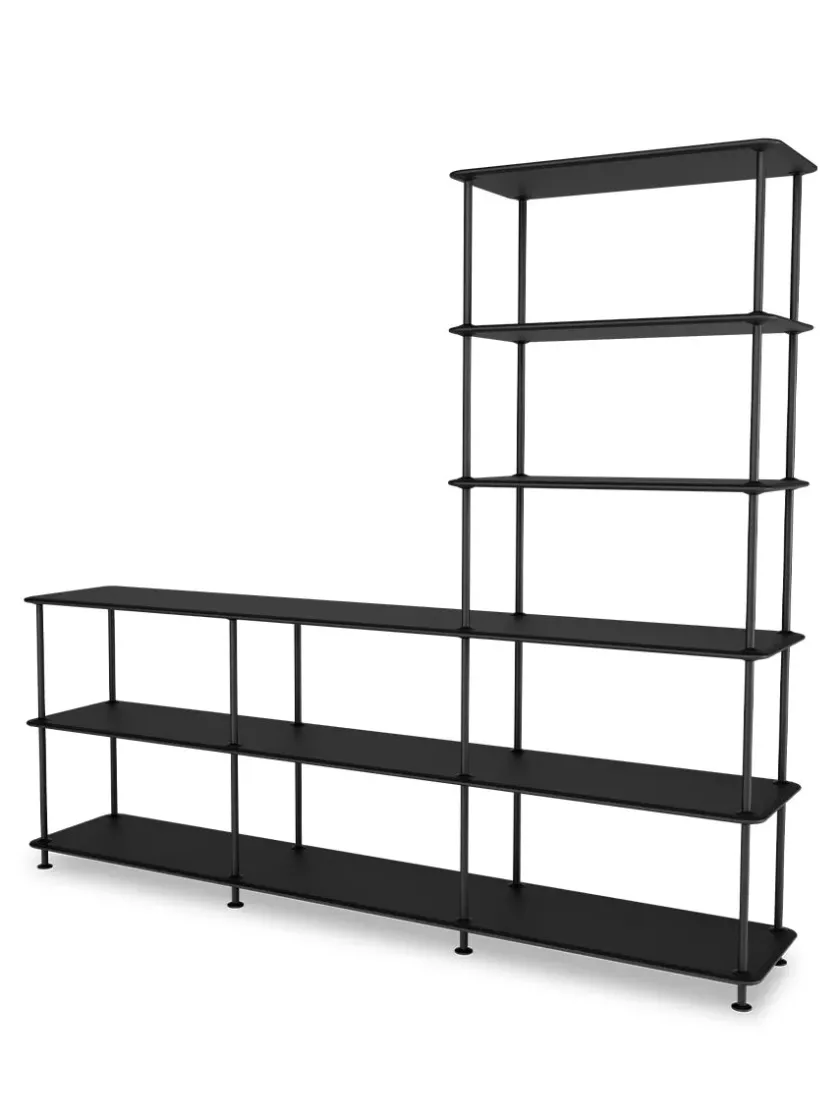 Montana Free reolsystemet er opbygget af lakerede MDF-hylder i dybde 38 adskilt af tynde stager i krom, der giver et let og svævende udtryk og understreger de horisontale hylder.