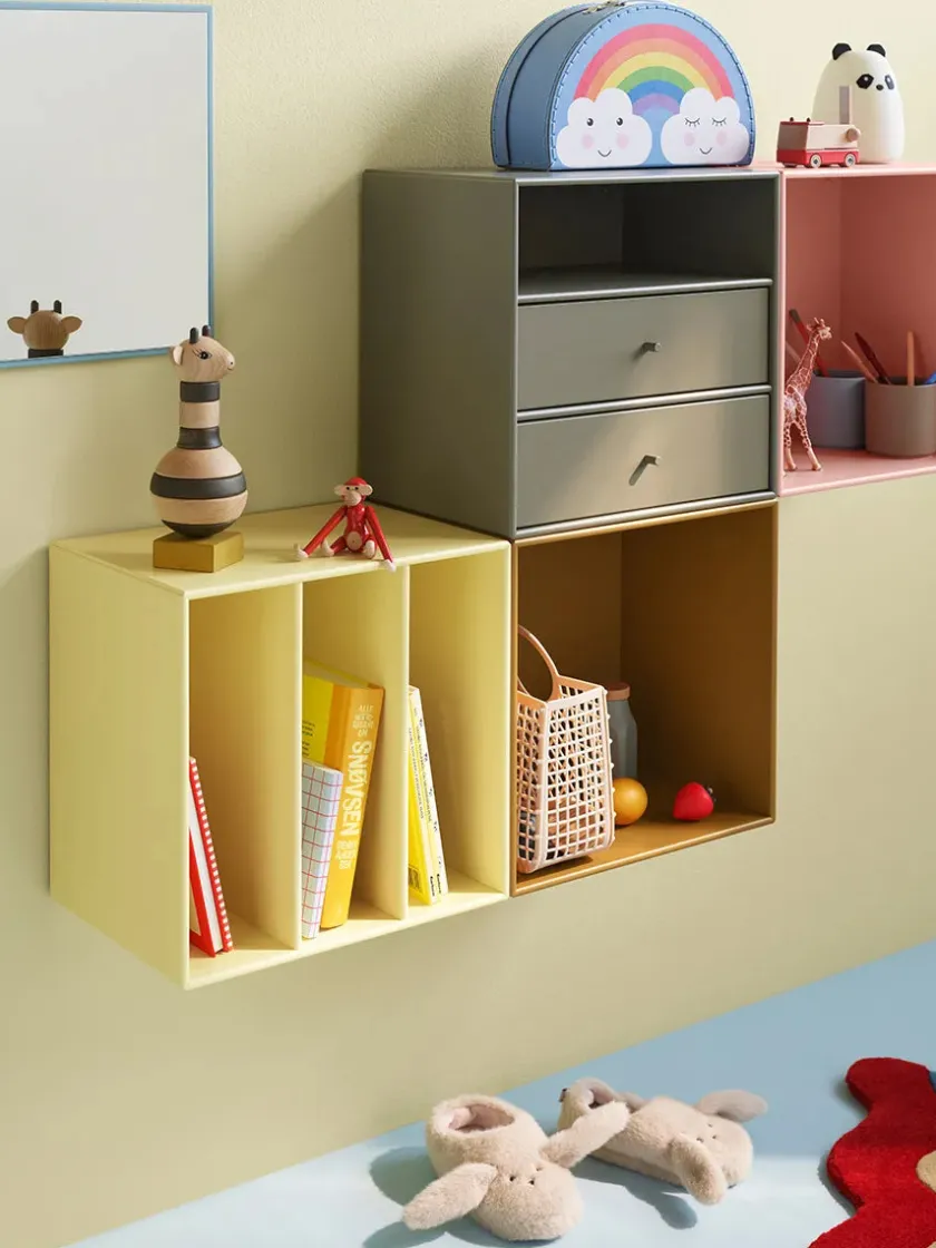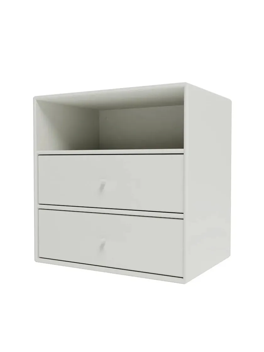 Montana Mini er en serie med mindre opbevaringsmoduler, som laves i 10 forskellige farver. Her finder du modulet med ét rum og to skuffer under, som giver gode muligheder for opbevaring af diverse ting, eksempelvis i soveværelset, entréen eller stuen. Serien laves af 8 millimeter MDF modsat de 12 millimeter, som resten af Montanas reoler. Ophæng medfølger.