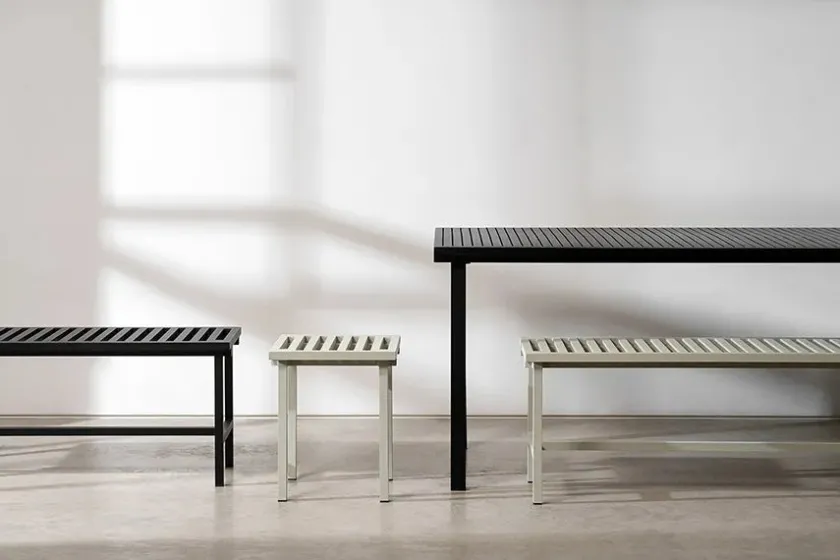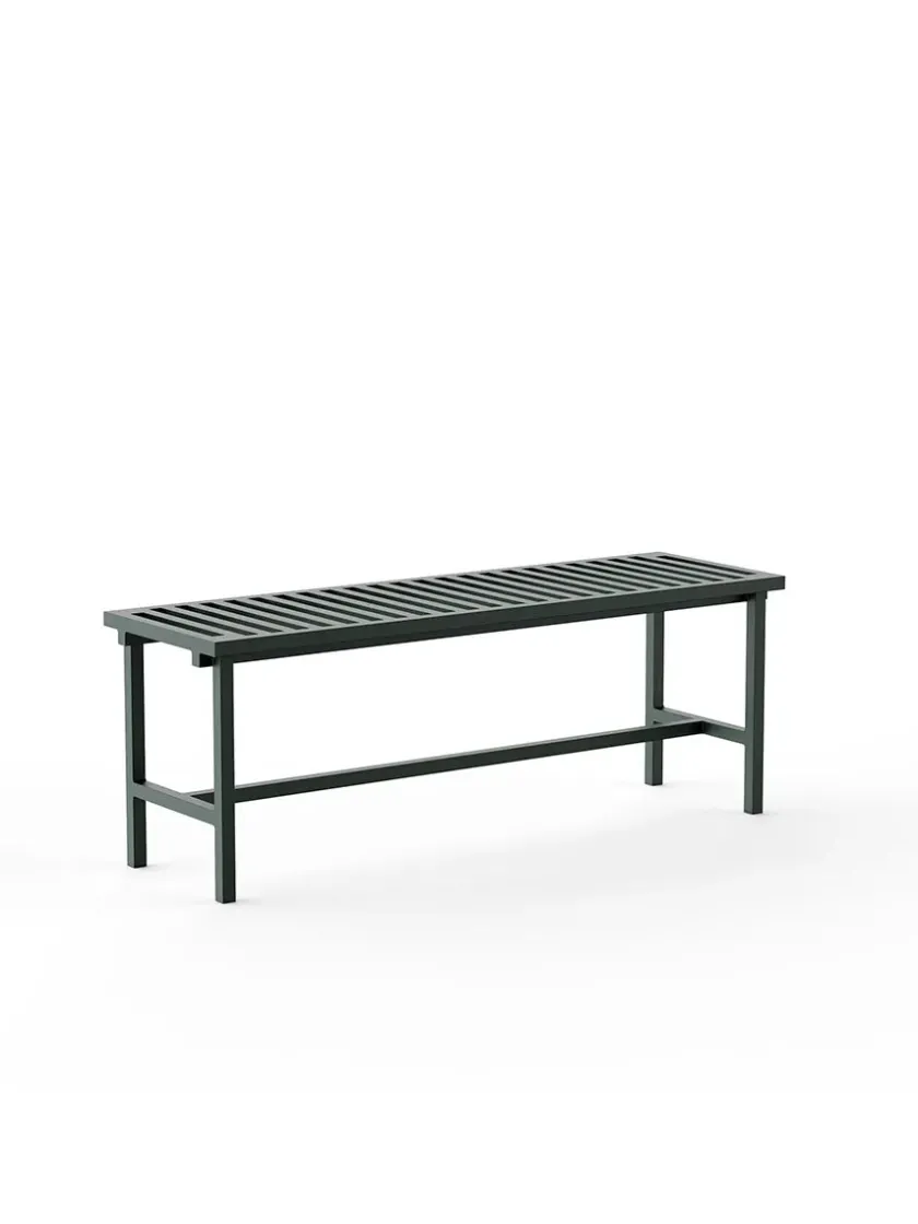 Grøn bænk fra 19 Outdoors. Bænken er lavet af aluminium og er pulverlakeret grøn. Havebænken fungerer både til et spisebord, men kan også sagtens bære at stå alene op af en væg.