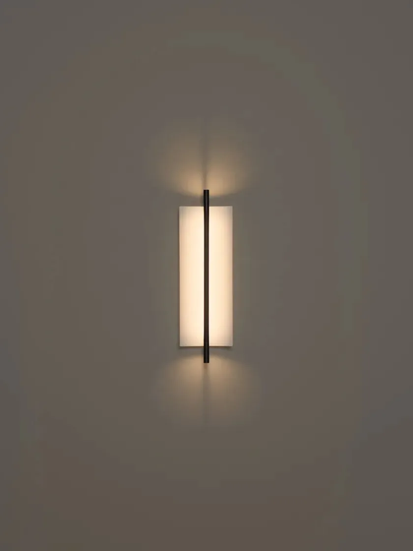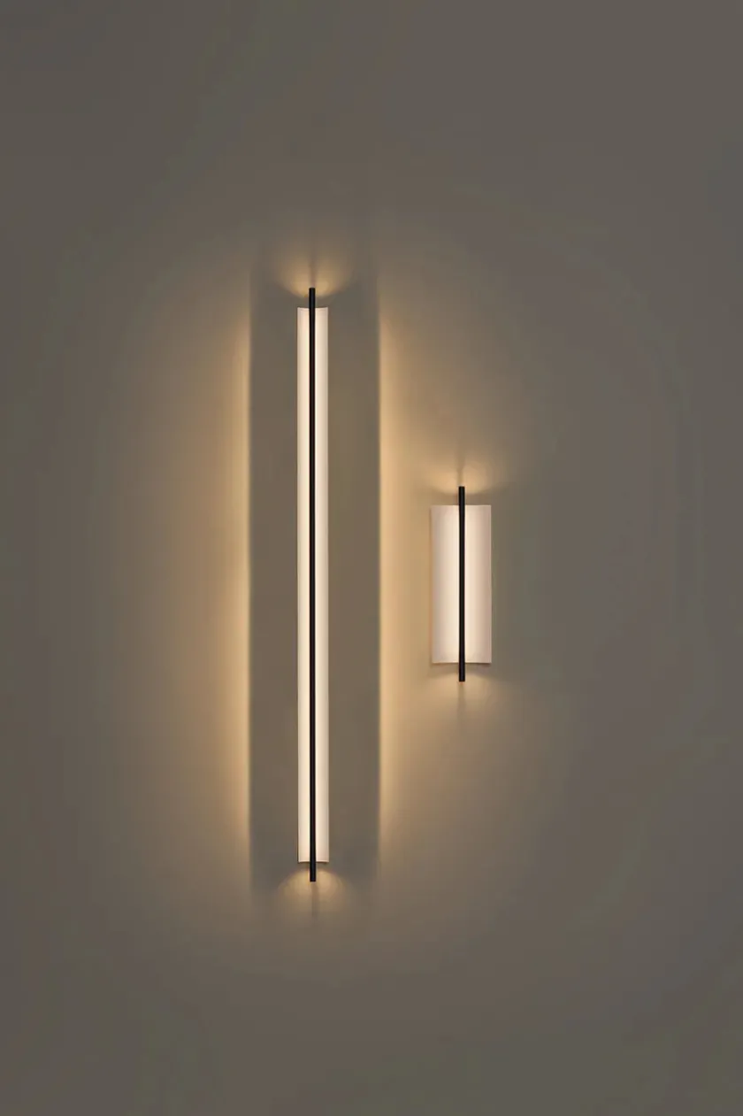 Lámina 45 væglampen har et minimalistisk og strømlinet design. Lampen passer perfekt ind i den moderne boligindretning med dens slanke silhuet. Lámina væglampen er udstyret med indbygget LED-lys og en tynd metalplade, der svagt men effektivt spreder lyset. Lampen ligner en lysende skulptur og kan bruges i flere rum i hjemmet. Skærmen er i en hvidgrå farve med blank finish udvendig, mens stellet er sort med mat finish.