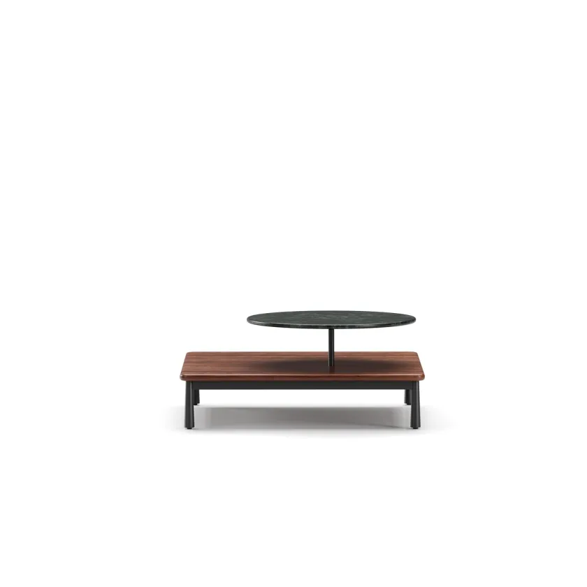 Den nederste plade er udført i naturlig valnød finer, mens den øverste, svævende bordplade i Verde Alpi-marmor tilfører et eksklusivt og unikt udtryk. Stellet i sort pulverlakeret stål (mat finish) fuldender det elegante design og sikrer stabilitet og holdbarhed.