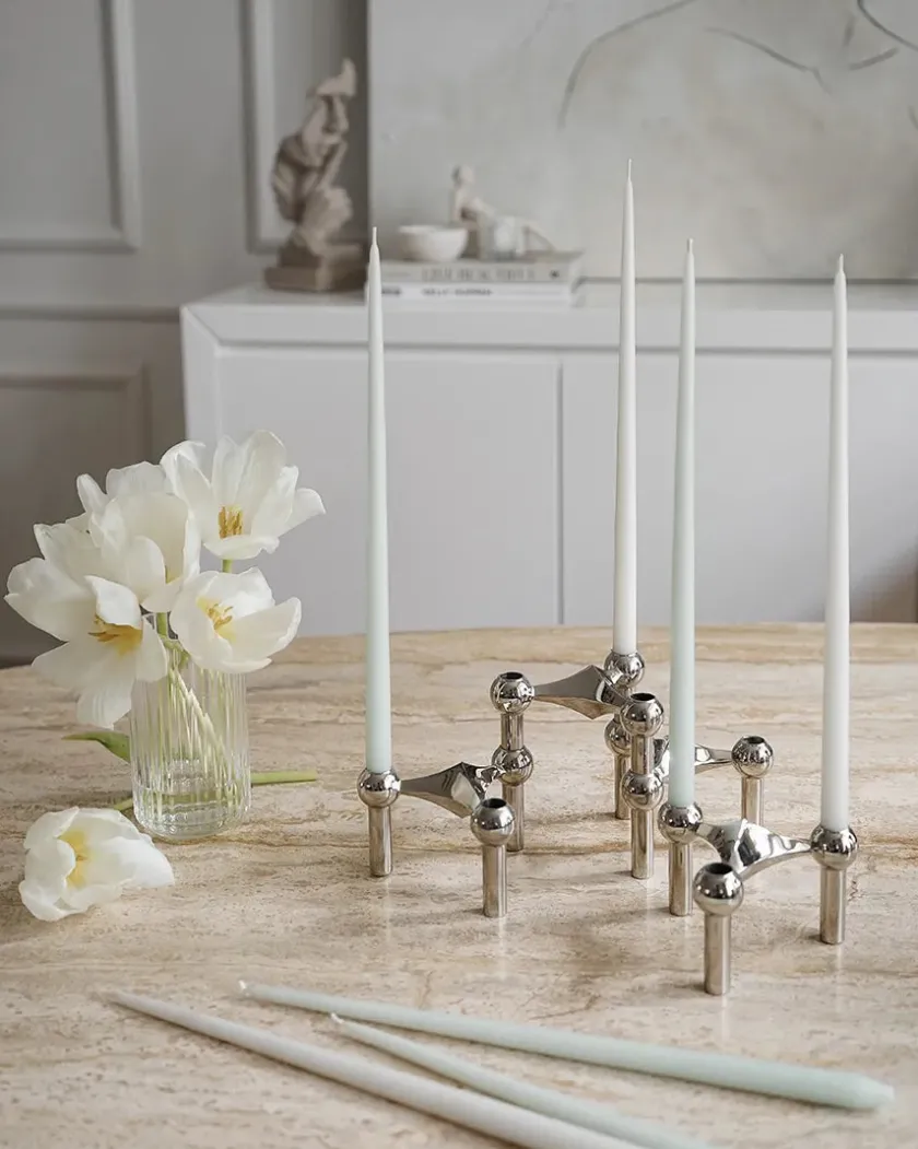 De eksklusive, håndfarvede STOFF Nagel kertelys er lavet af danske Ester & Erik og har en lang og konisk form med en kegleformet bund, så de passer perfekt i lysestagerne. Lysene drypper ikke, er selvslukkende og brænder langsomt og elegant ud, så der ikke er rester tilbage i dine lysestager.