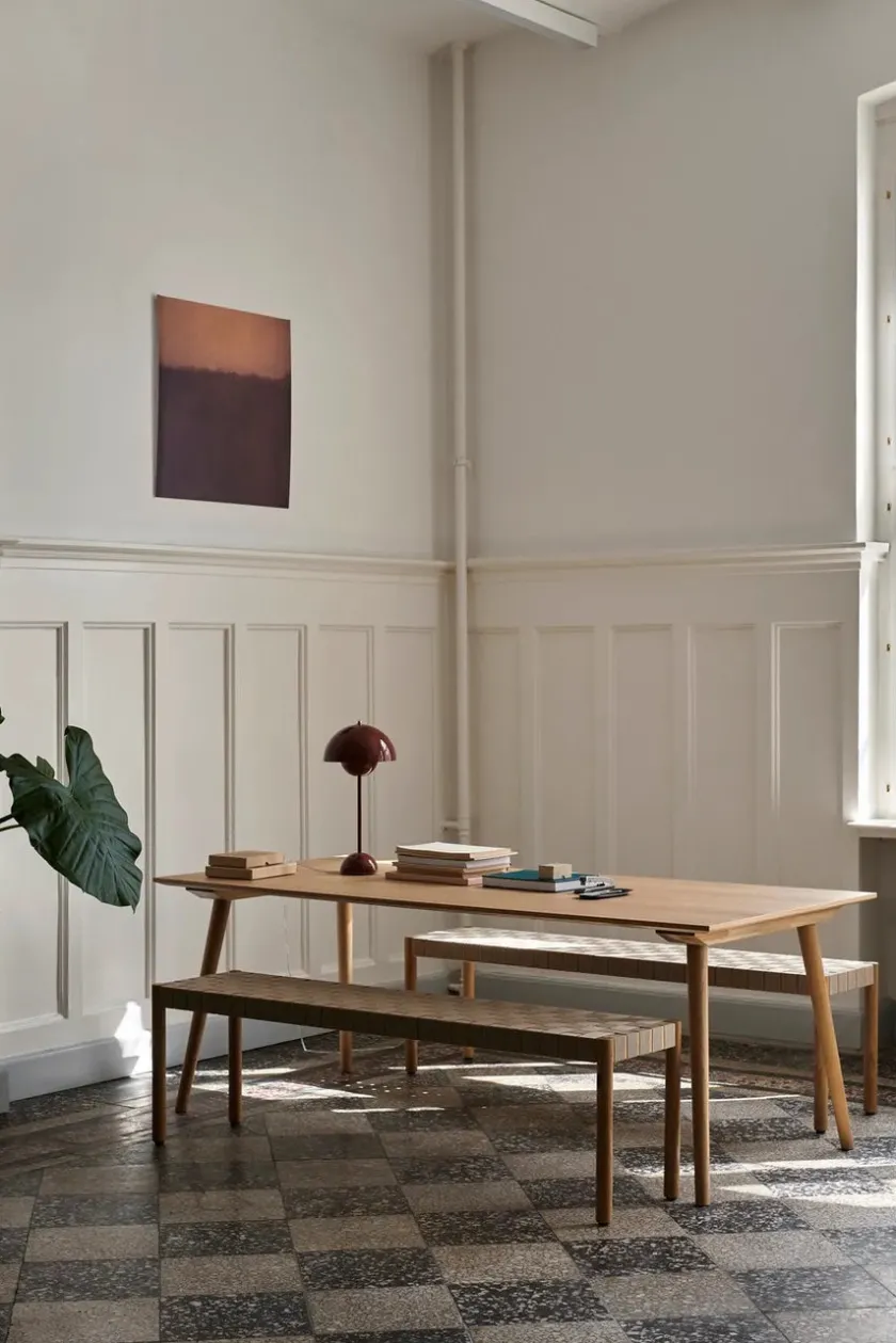 Betty bænk TK4 fra &Tradition er opkaldt efter Betty Nansen-teatret i København og er lavet af bånd, der er håndlavet af naturlige linnedfibre. Rammen er af massiv egetræ og fås i fire moderne kombinationer: sort/natur, tusmørke/natur, rødbrun/natur og sort/sort.