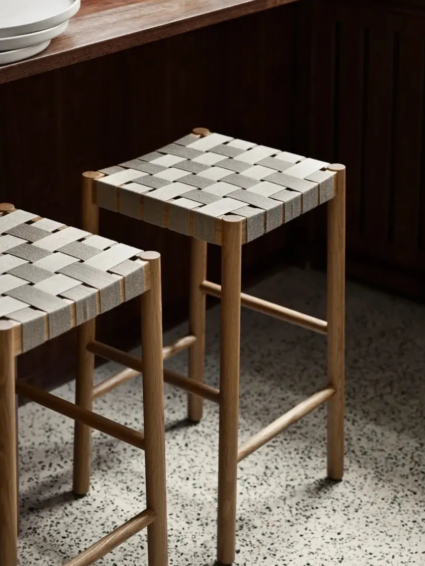 Betty barstol TK8 fra &Tradition er opkaldt efter Betty Nansen-teatret i København og er lavet af lakeret eg. Sædet er lavet af naturlige linnedfibre og vævet i hånden, som giver en blød, polstret base.