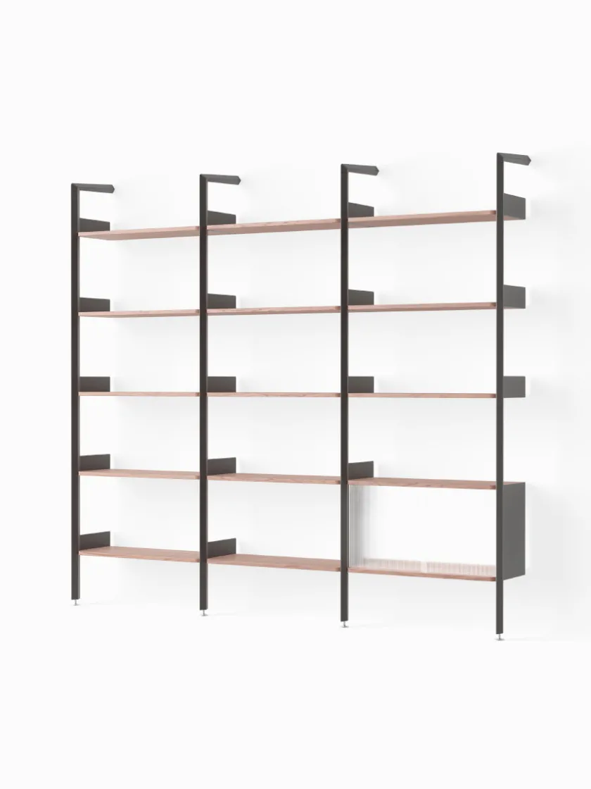 Rombe konfiguration J består af Rombe IF3, IF5 og IF6, som dermed består af både hylder, en skriveplade og to skabe med riflede glaslåger. Fås med hylder i enten alabaster, eg, anthracite eller valnød. Resultatet er en harmonisk løsning, hvor åbne hylder og skjult opbevaring supplerer hinanden elegant.