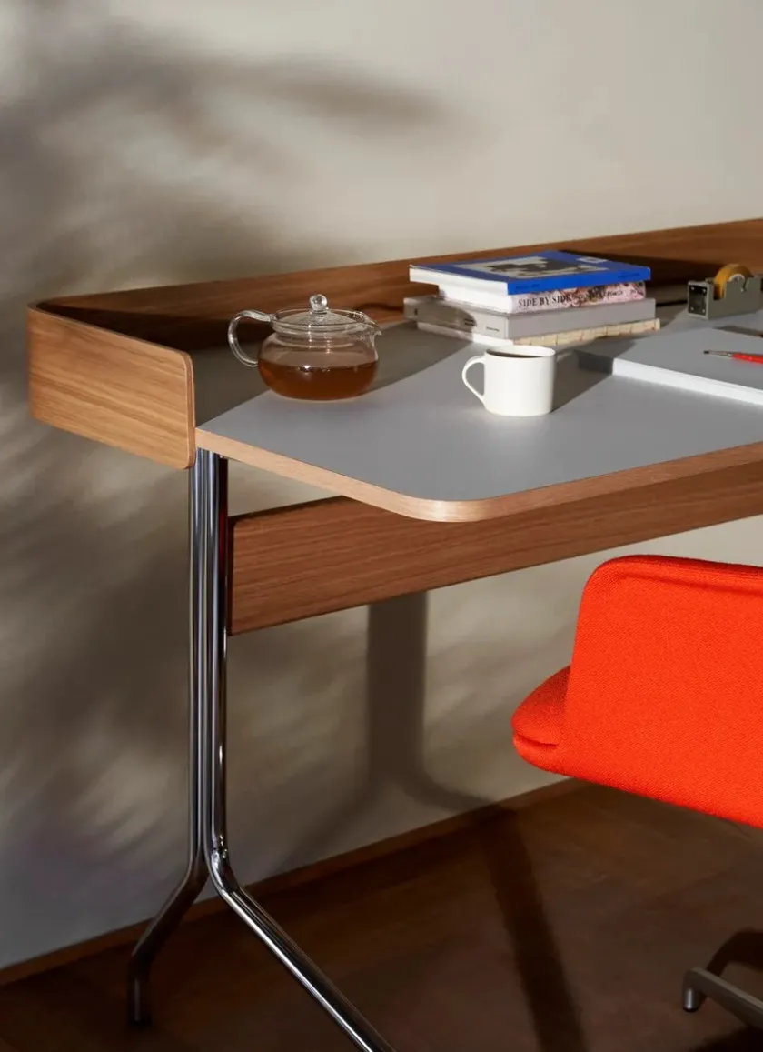 Pavilion AV17 skrivebord er tegnet af design duoen Anderssen & Voll i 2020. Det fine skrivebord er lavet med en linoleum bordplade med panel i eg eller valnød finér. Stellet er lavet i stål. Bordet fås i to kombinationer.