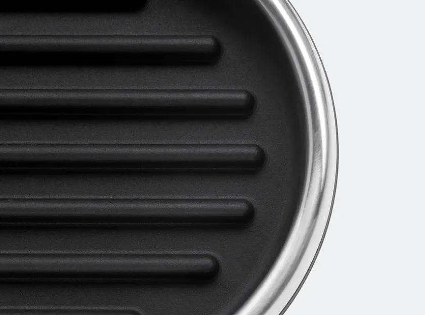 Med dele der kan gå i opvaskemaskinen, kan sæbeskålen let skilles ad og rengøres. En silikonebase beskytter overflader, mens en rillet indsats holder sæben tør.