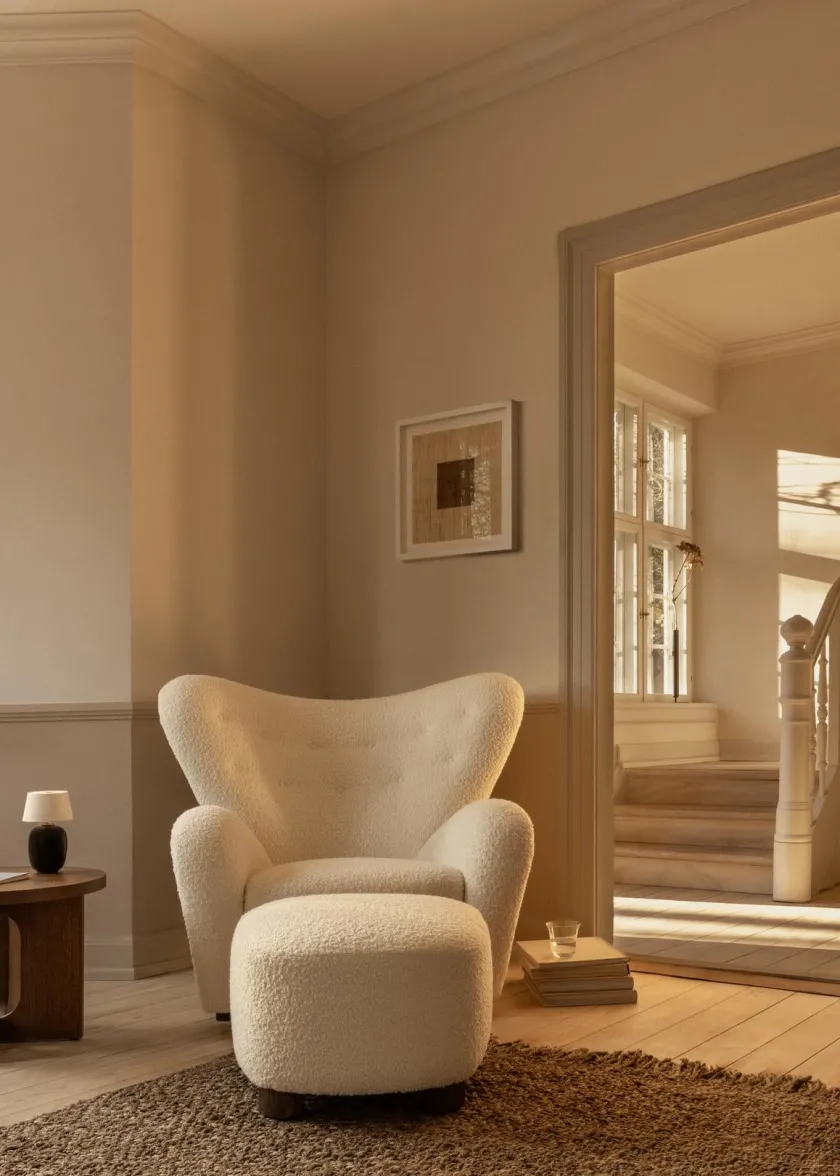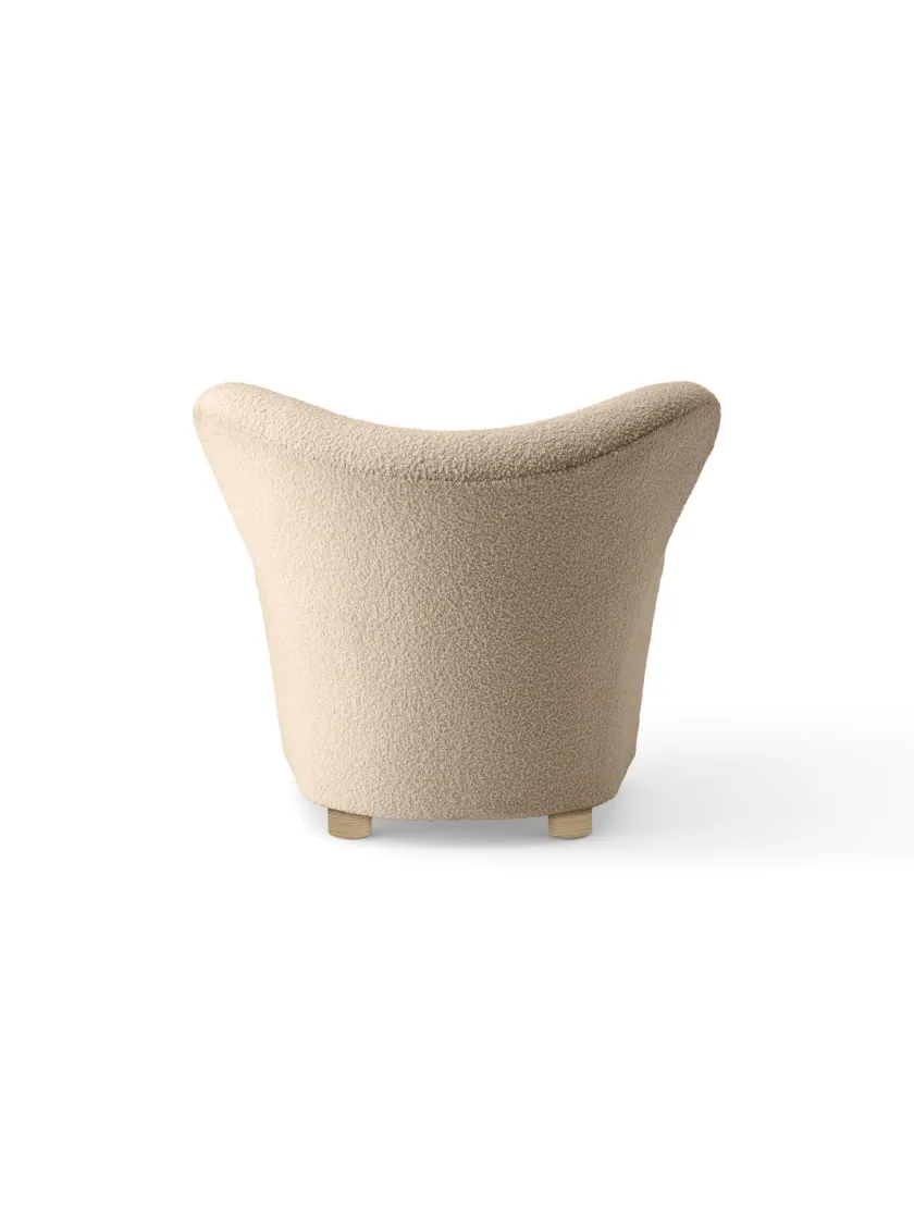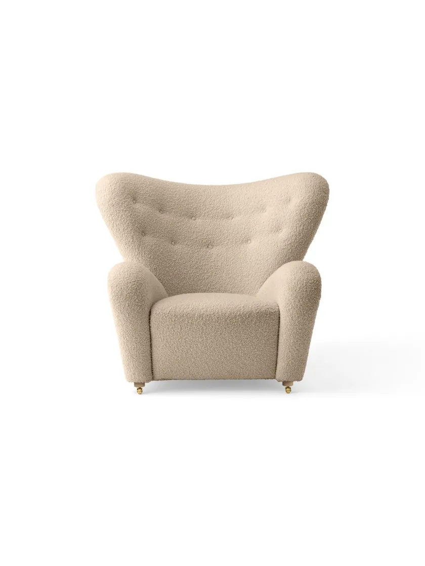 Den Trætte Mand i Baena 15 (lys beige bouclé) er Audo Copenhagens poetiske opdatering af Flemming Lassens klassiker. Den runde, “vingede” form omslutter kroppen, mens den taktile bouclé giver rolig varme til indretningen. Vælg ben i eg for et lyst, naturligt udtryk – eller mørkbejdset eg for en skarp, grafisk kontrast. Med forreste messinghjul, generøse mål og mulighed for matchende ottoman er dette et tidløst statement-piece skabt til hverdagsluksus i stuen, læsehjørnet eller soveværelset.