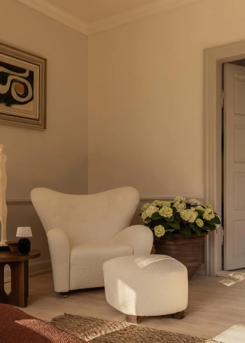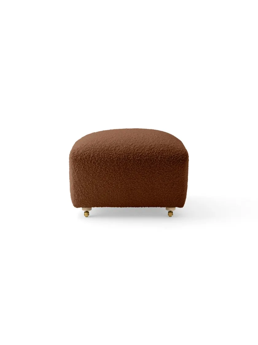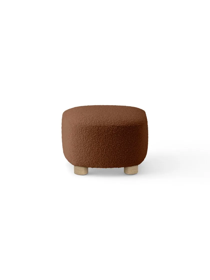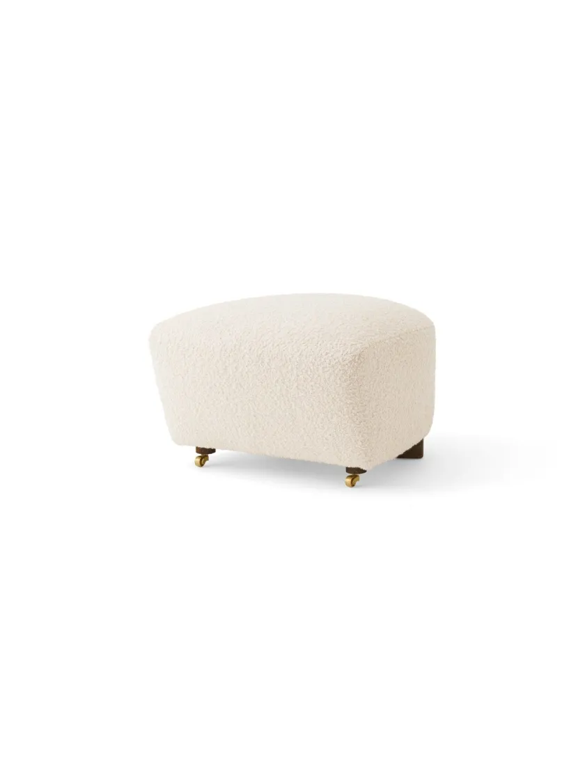 Fuldend komforten med Den Trætte Mand fodskammel i Baena 95 fra Audo Copenhagen. Den varme brunlige bouclé fremhæver de bløde, afrundede linjer og matcher lænestolen perfekt. Vælg ben i eg for et naturligt look – eller mørkbejdset eg for markant kontrast. De forreste messinghjul gør skamlen let at flytte mellem læsehjørnet, sofaen og pejsen.