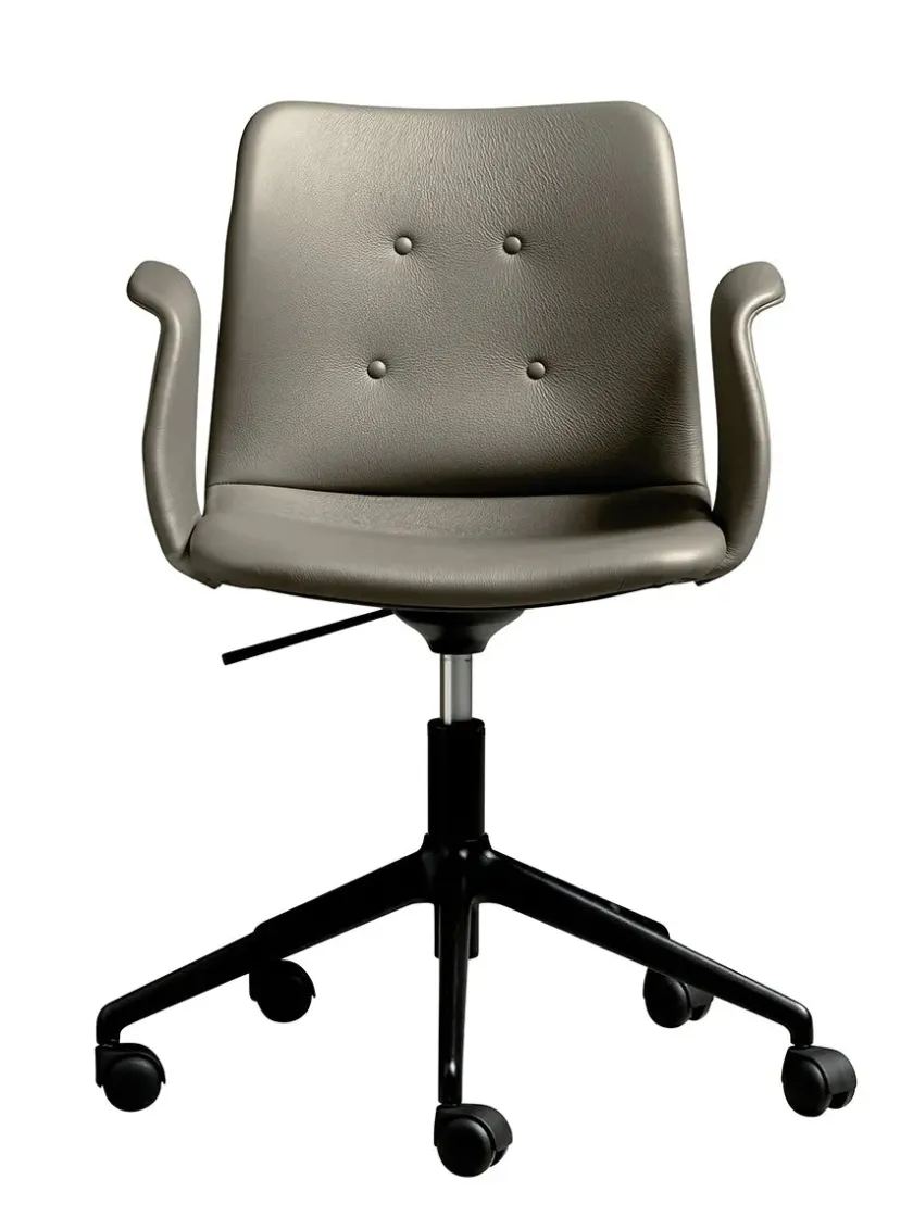 Den karakteristiske ryg bøjer sig let og tilpasser sig brugerens rygsøjle, hvilket giver optimal støtte gennem hele arbejdsdagen. Sæde og ryg er polstret med formstøbt koldskum og betrukket med eksklusive tekstiler eller læder. Det femstjernede drejeunderstel i poleret eller sortlakeret aluminium sikrer både stabilitet og bevægelsesfrihed. Stolen har justerbar siddehøjde og er udstyret med hjul, hvilket gør den ideel til både hjemmekontoret og det professionelle arbejdsmiljø.