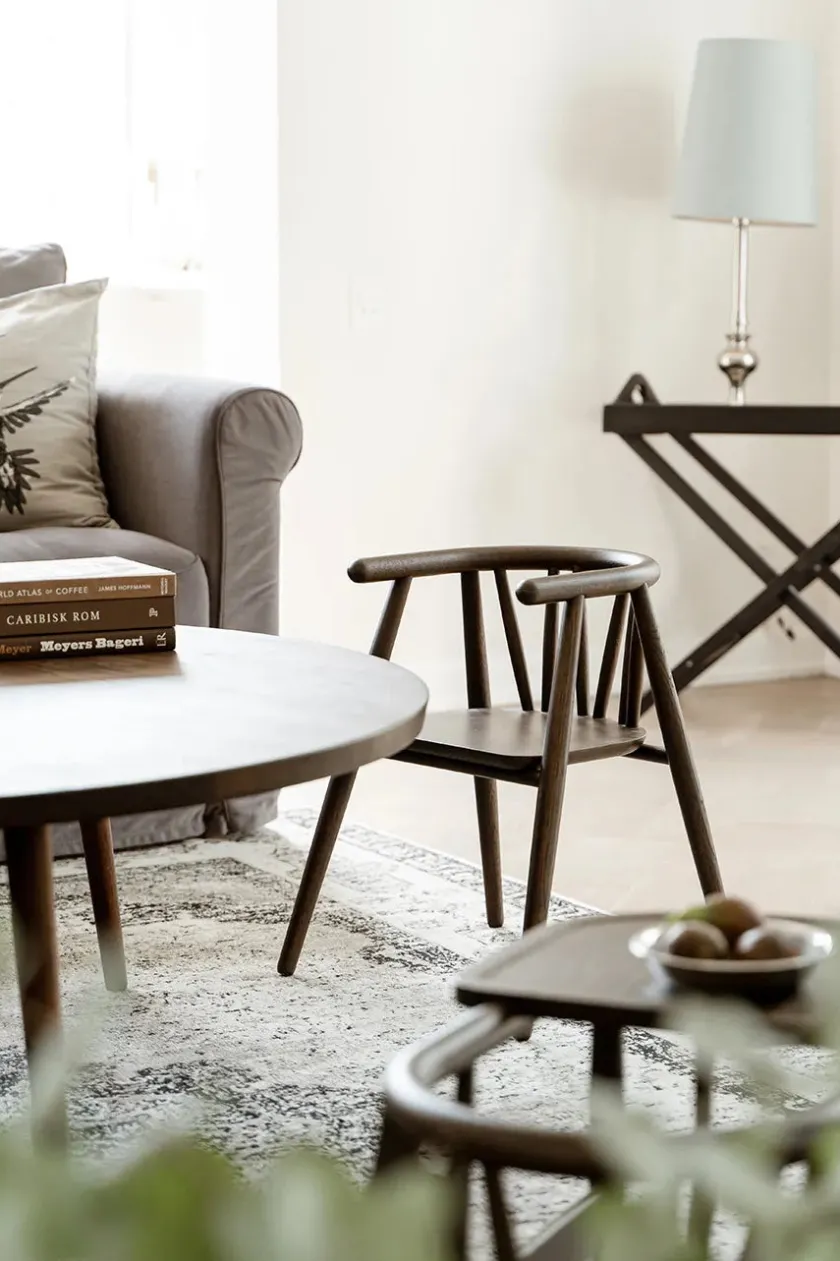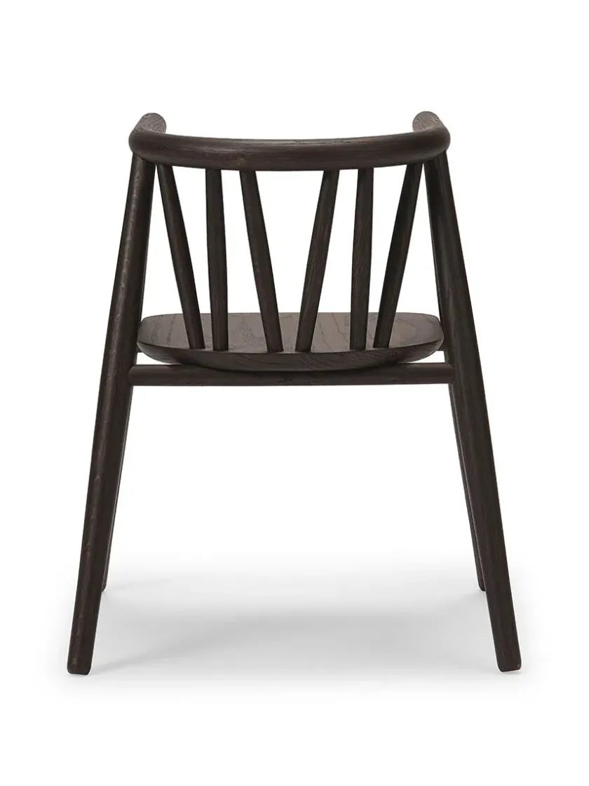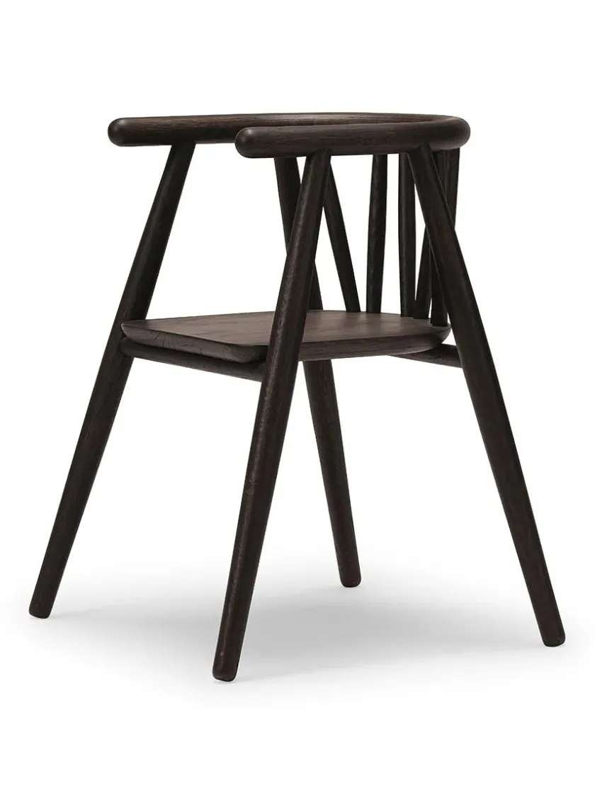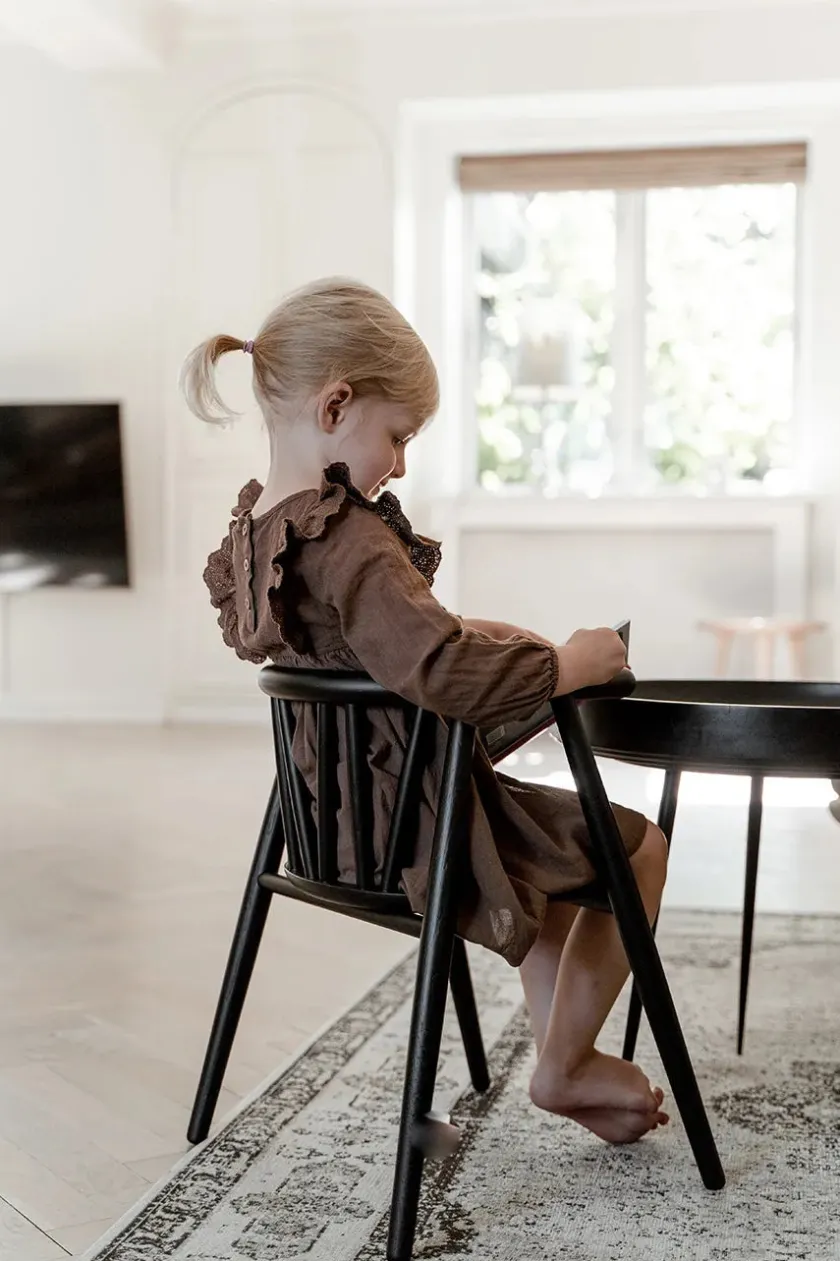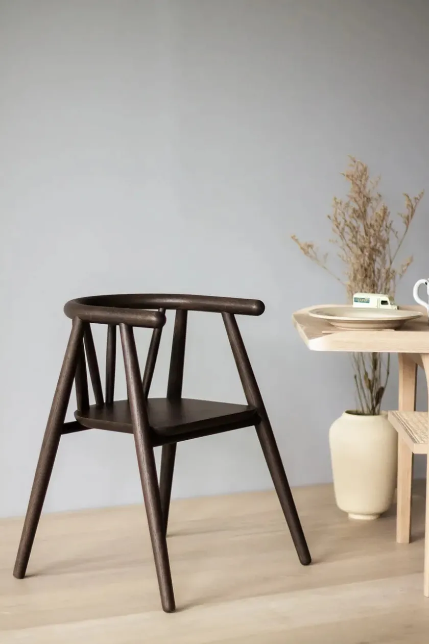 Storm børnestol fås i tre forskellige varianter. Stolen er her i egetræ med røget bejdse. Det mørke egetræ giver stolen et elegant look.