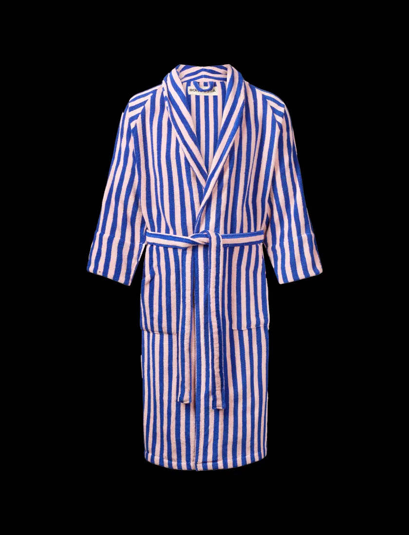 Naram badekåben fra Bongusta i farven Camel & Ultramarine er skabt til langsomme morgener og varme aftener. Den lange, unisex pasform kombinerer klassiske striber med en generøs komfort: sjalkrave, åben front, to rummelige lommer og et kraftigt bælte. Frottéen er 100% kæmmet OEKO-TEX® bomuld vævet i ca. 385 g/m² for høj absorbering og holdbarhed, hvilket giver en blød, poleret overflade vask efter vask. Kåben fås i S/M og L/XL med mål fra nakke til bundsøm på hhv. 122 og 138 cm; er du over 176 cm eller ønsker et mere oversized udtryk, anbefales L/XL. Vaskes ved op til 60° og hænges gerne til tørre for at bevare farver og fibre. Bemærk, at stoffet kan krympe 5–10% efter første vask. Kort sagt: et farverigt, tidløst design med funktionelle detaljer—perfekt efter badet, i sommerhuset eller til et køligt havdyp.