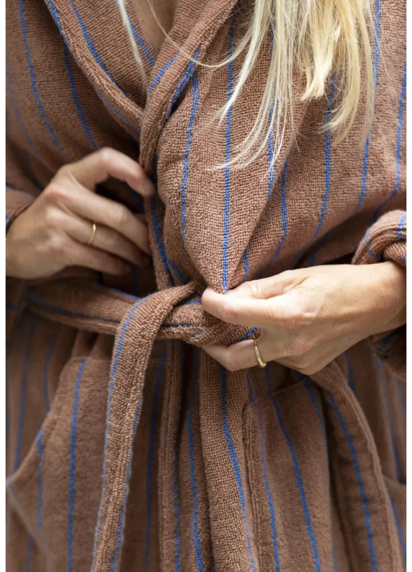 Svøb dig i Naram badekåben fra Bongusta i farven creme & ink – en blød, absorberende frotté i 100% kæmmet OEKO-TEX® bomuld, vævet i 385 g/m² for høj komfort og holdbarhed. Den lange, unisex pasform er skabt til rolige morgener og stunder efter badet: sjalkrave, åben front, to rummelige lommer og et kraftigt bindebælte giver både funktion og luksus i hverdagen. Længden er tænkt til fuld dækning; er du over 176 cm eller ønsker et løsere udtryk, anbefales L/XL. Naram fås i to størrelser, og længden måles fra nakke til bundsøm: S/M 122 cm og L/XL 138 cm. Den kæmmede kvalitet polerer fibrene for glans og en silkeblød fornemmelse, og kåben kan vaskes ved 60°; ophængsløkke i kraven gør hverdagen nem. Kort sagt: tidløs, farverig velvære fra Bongusta.